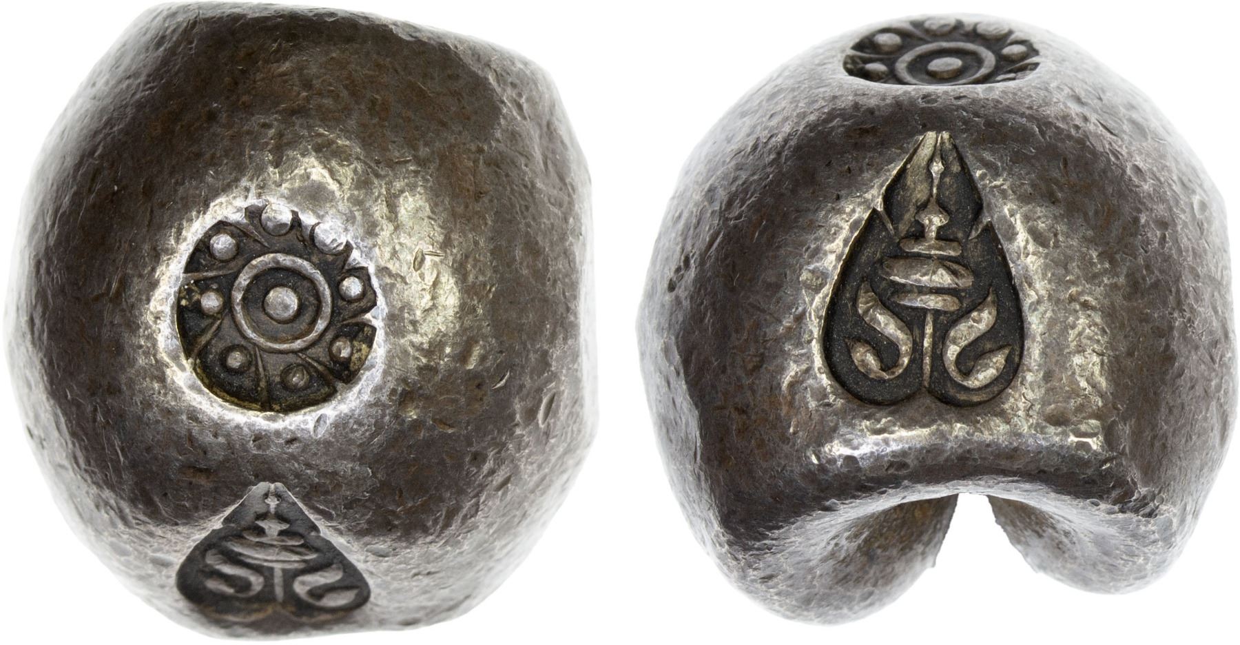 THAILAND: Rama IV, 1851-1868, AR tamlung (4 baht) (60.55g), ND, Cr-139.1, Krisadaolarn & Mihailovs-Plate E31, large bullet money, Mongkut and Chakra stamps, variety with eight dots in Chakra, bold stamps, XF.