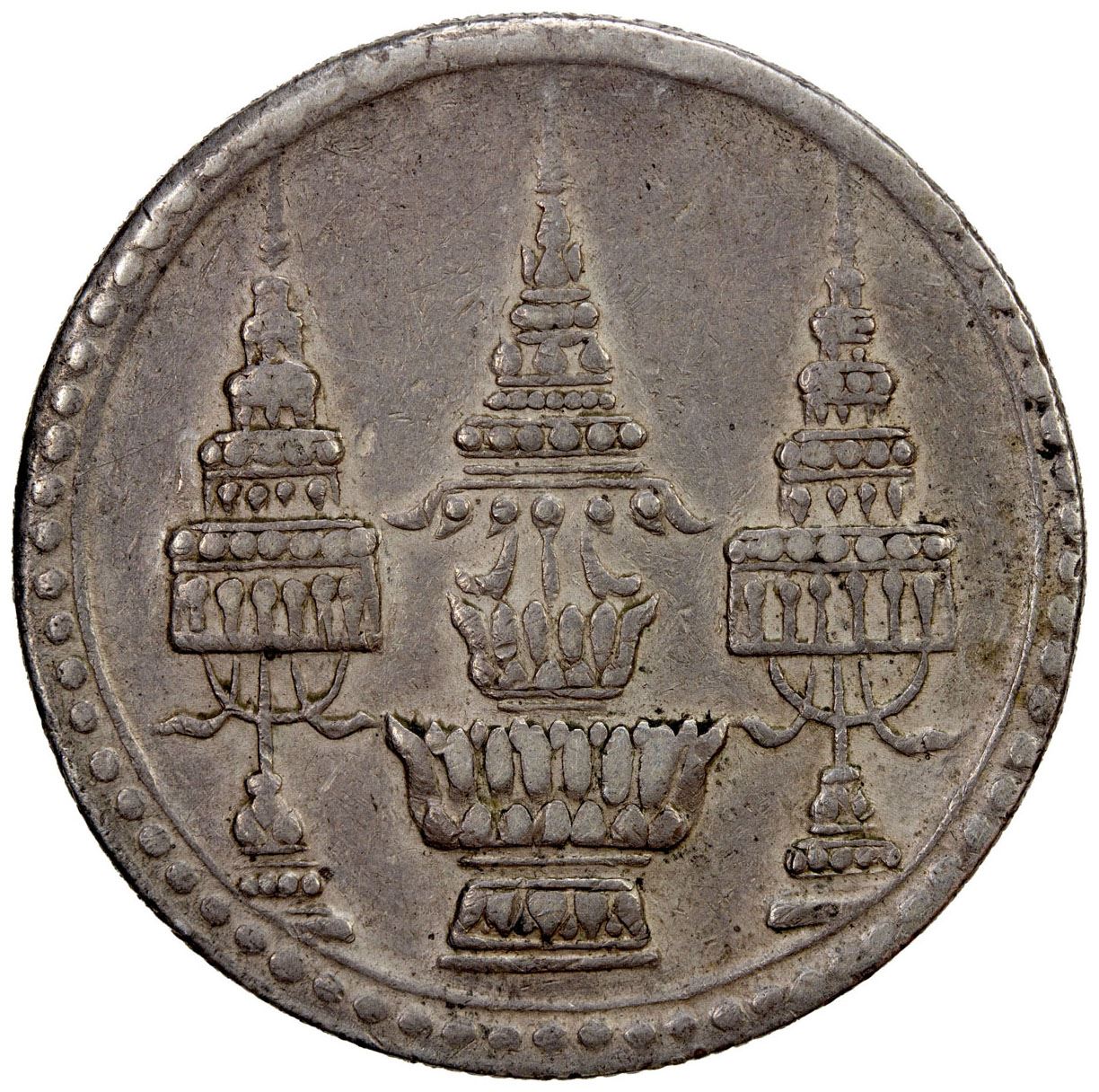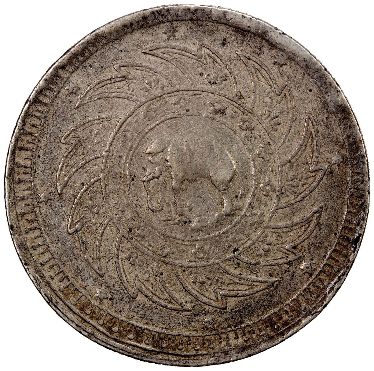 THAILAND: Rama V, 1868-1880, AR baht, ND (1869), Y-31, crown with umbrellas // elephant within chakra, VF.