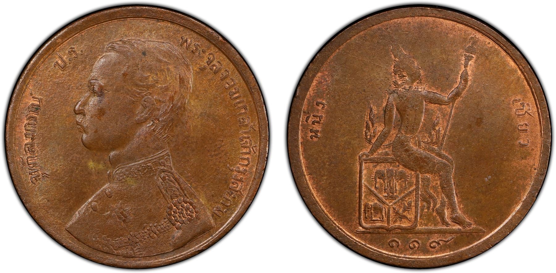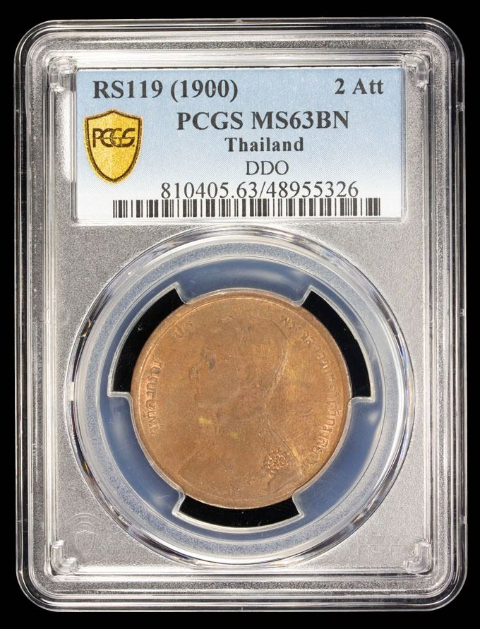 THAILAND: Rama V, 1868-1910, AE 2 att, RS119 (1900), Y-23, doubled die obverse (DDO), lightly lustrous with orange highlights, PCGS graded MS63 BN. Finest graded of this date by PCGS.
