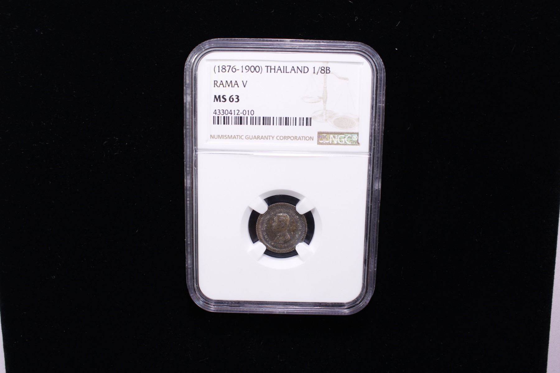 THAILAND: Rama V, 1868-1910, AR 1/8 baht (fuang), ND (1876-1900), Y-32, lustrous with toning, NGC graded MS63.