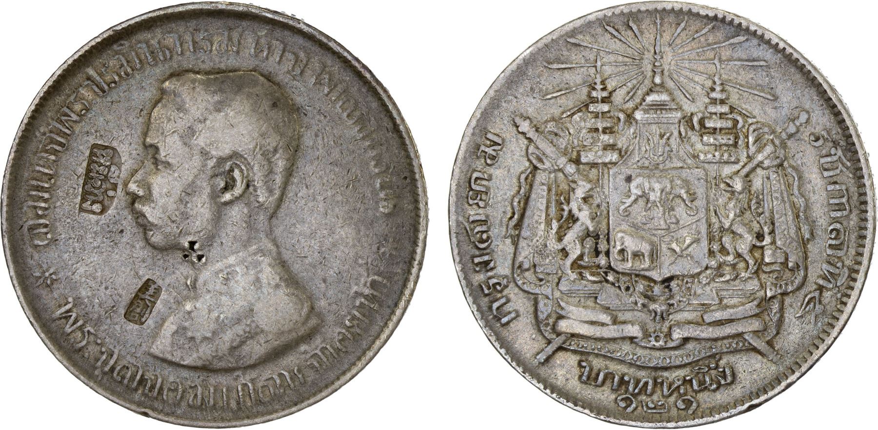 THAILAND: Rama V, 1868-1910, AR baht, RS121 (1902), Y-34, two chopmarks, original toning, XF.