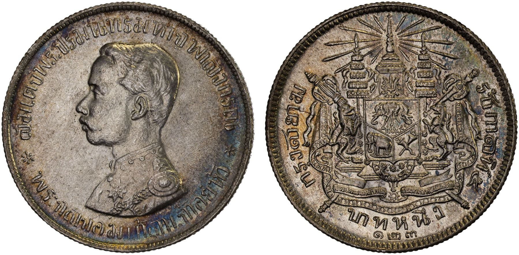 THAILAND: Rama V, 1868-1910, AR baht, RS123 (1904), Choice XF