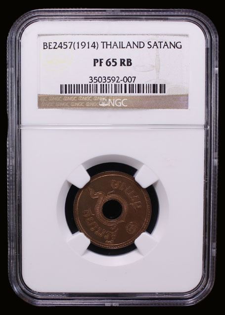 THAILAND: Rama VI, 1910-1925, AE satang, BE2457 (1914), Y-35, Schön-194, lustrous, unlisted in proof in Krause, rare, NGC graded Proof 65 RB, ex The 1914 Collection. Finest graded at NGC and PCGS.