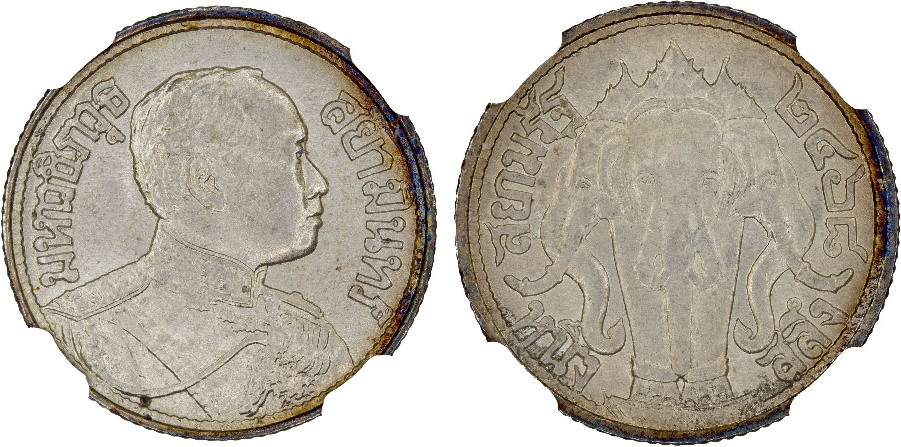 THAILAND: Rama VI, 1910-1925, AR salung (1/4 baht), BE2468 (1925), Y-43a, Elephants, nice luster, with light peripheral toning, NGC graded MS65.