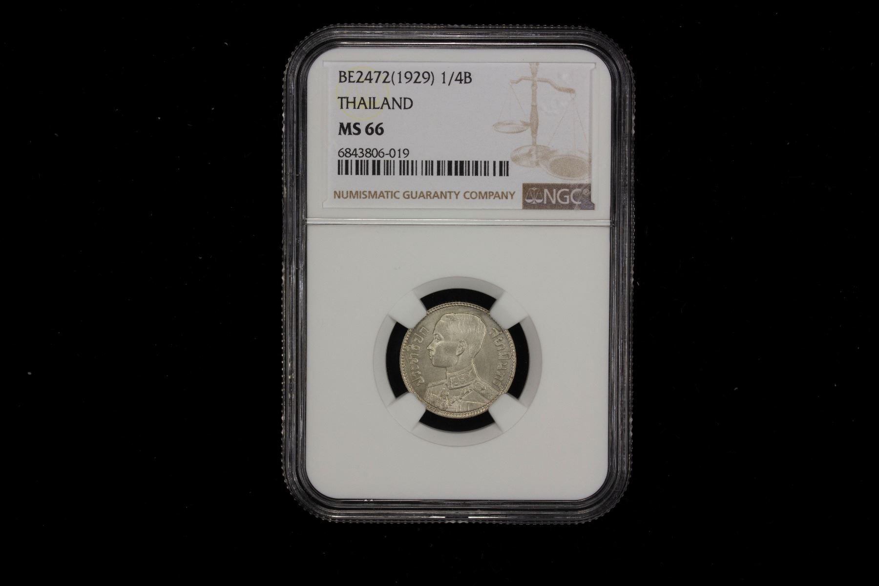 THAILAND: Rama VII, 1925-1935, AR 25 satang (1/4 baht), BE2472 (1929), Y-48, one year type, a fantastic lustrous example! NGC graded MS66. Tied for finest known in the NGC census.
