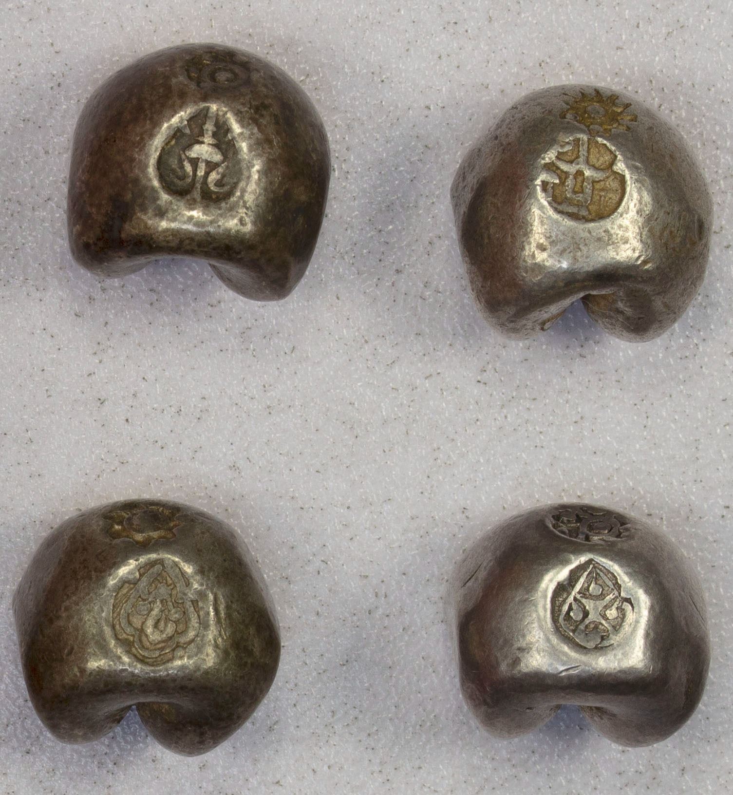 THAILAND: Rattanakosin Kingdom, LOT of 4 bullet money, also known as pot duang, all 1-baht, with unalom (Rama I), krut (Rama II), prasat (Rama III), and mongkut (Rama IV) stamp respectively in addition to the chakri stamp; all in average VF conditions; retail value $150, lot of 4 pieces.