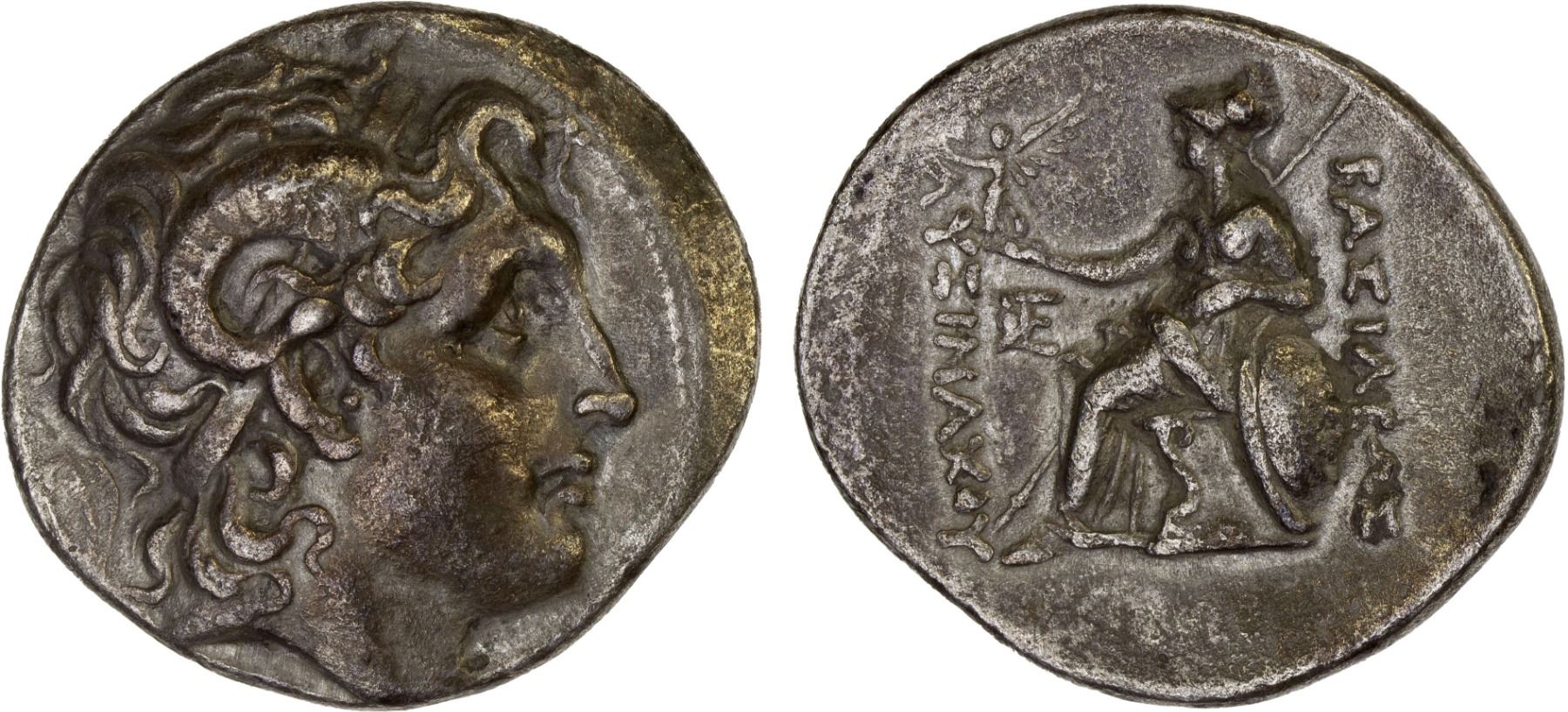 THRACIAN KINGDOM: Lysimachos, 305-281 BC, AR tetradrachm (15.72g), uncertain mint, Müller-478, diademed head of deified Alexander III right, with horn of Ammon // Athena Nikephoros seated left, holding in right hand Nike crowning the king's name, resting left arm on shield decorated with lion's head, lightly grainy surfaces, VF.