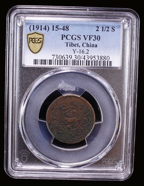 TIBET: AE 2½ skar, BE 15-48 (1914), Y-16.2, Autonomous Tibetan issue, snow lion looking backwards with sun and three ornaments within circle, PCGS graded VF30, ex SARC Internet Auction 17 Lot 562, ex The 1914 Collection.