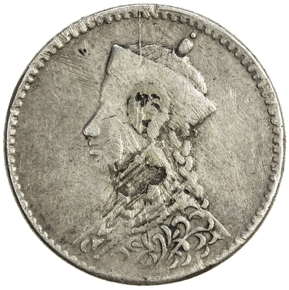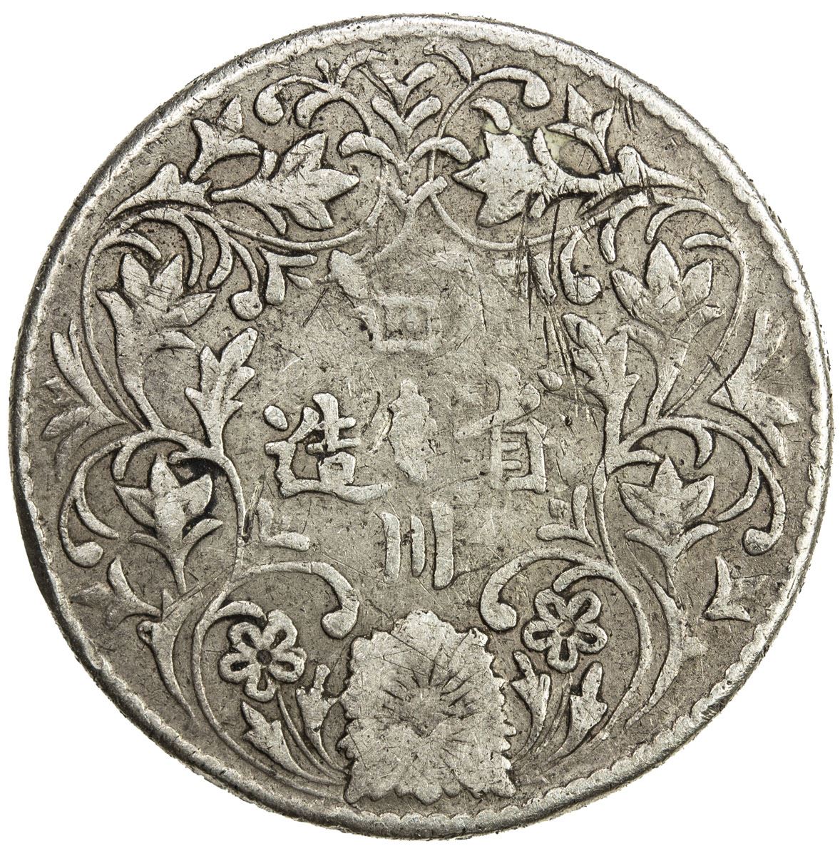 TIBET: AR ¼ rupee, Chengdu mint, ND (1904-12), Y-1, L&M-362, Szechuan-Tibet trade issue, portrait of the Chinese emperor Guang Xu derived from the British Indian rupee of Queen Victoria // vertical rosette at center, Chinese inscription, si chuan sheng zao ("made in Sichuan"), branches with cusps and flowers around, a feature also derived from the reverse of British Indian rupees, button mount removed at center, Fine.