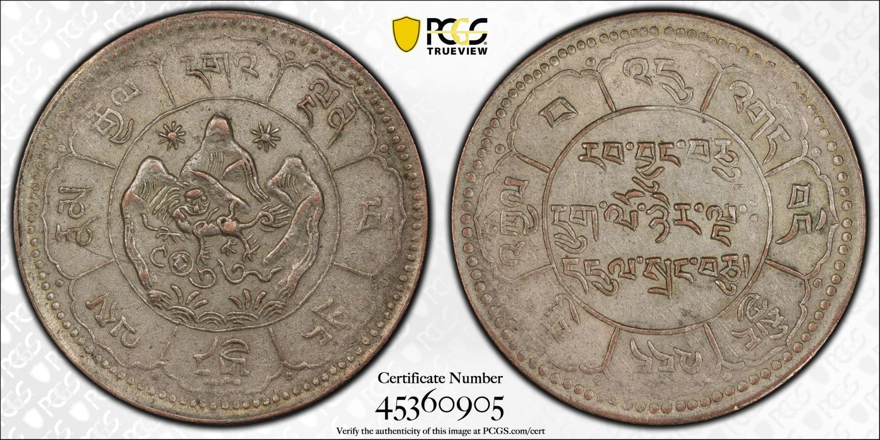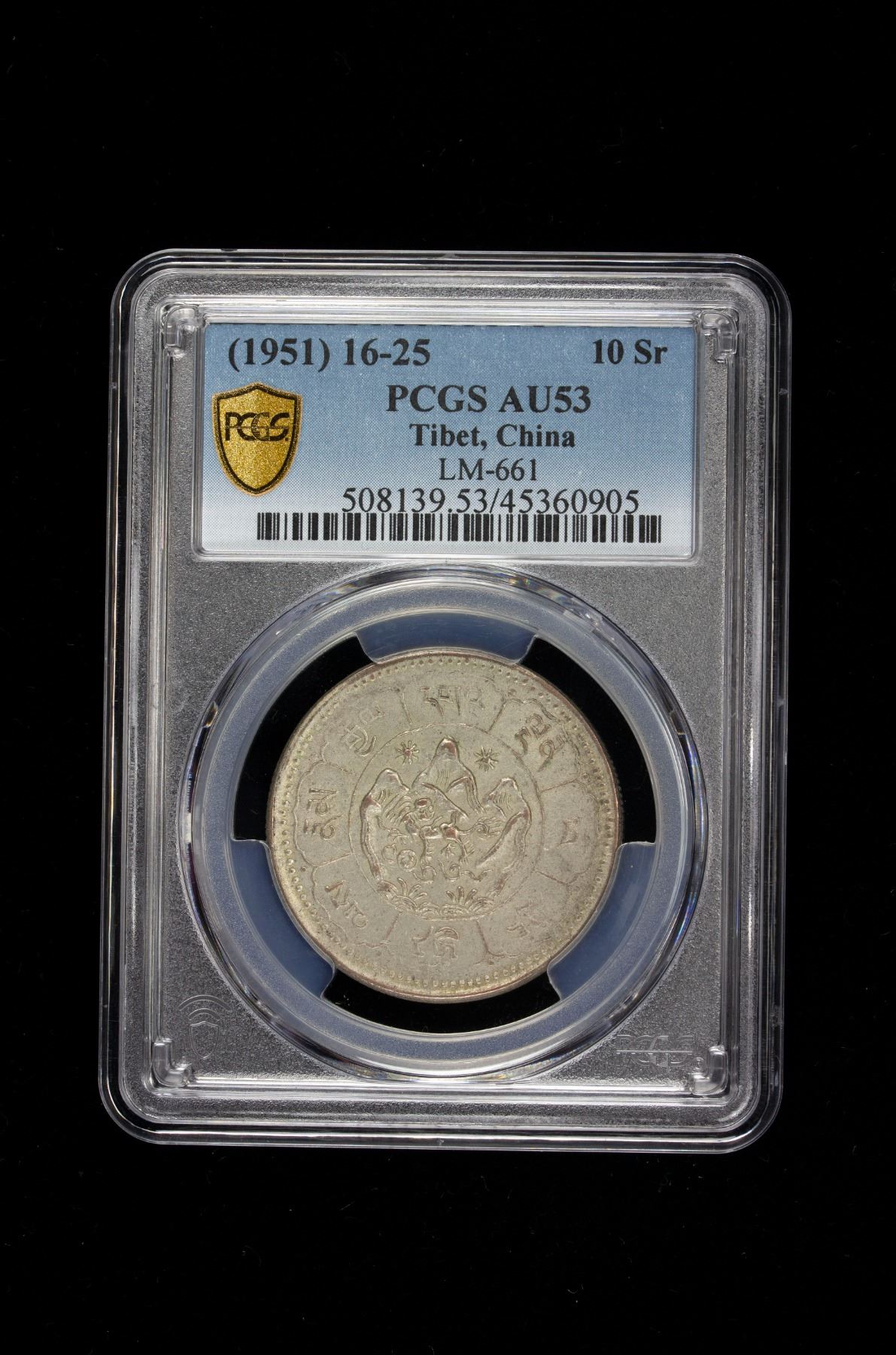 TIBET: AR 10 srang, BE16-24 (1950), Y-30, L&M-661, Autonomous Tibetan issue, snow lion facing left in front of Mount Kailash with two suns in the background, PCGS graded AU53.