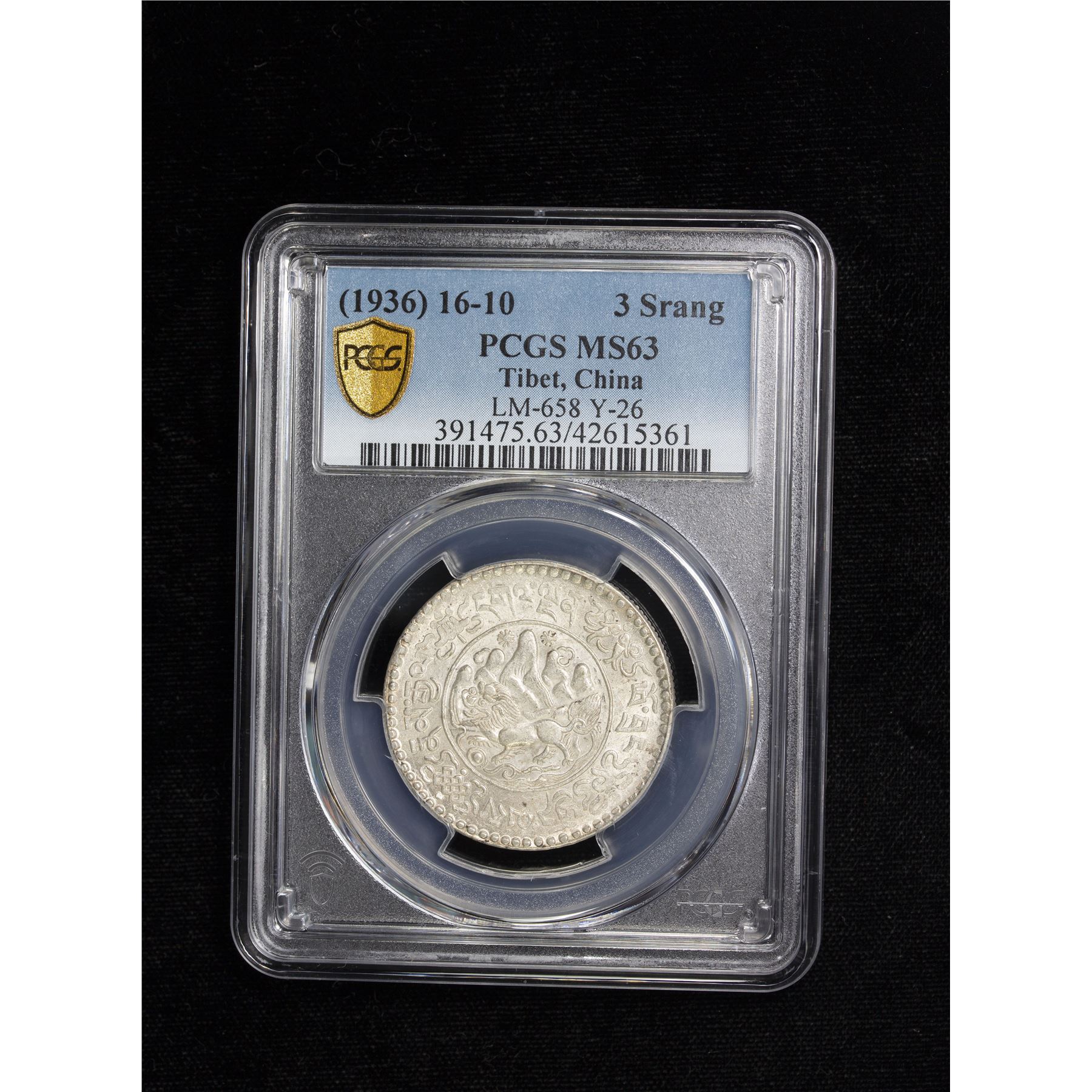 TIBET: AR 3 srang, BE16-10 (1936), Y-26, L&M-658, Autonomous Tibetan issue, snow lion facing left in center with Himalayan range behind with two suns above and ornament below, a lovely mint state example! PCGS graded MS63.