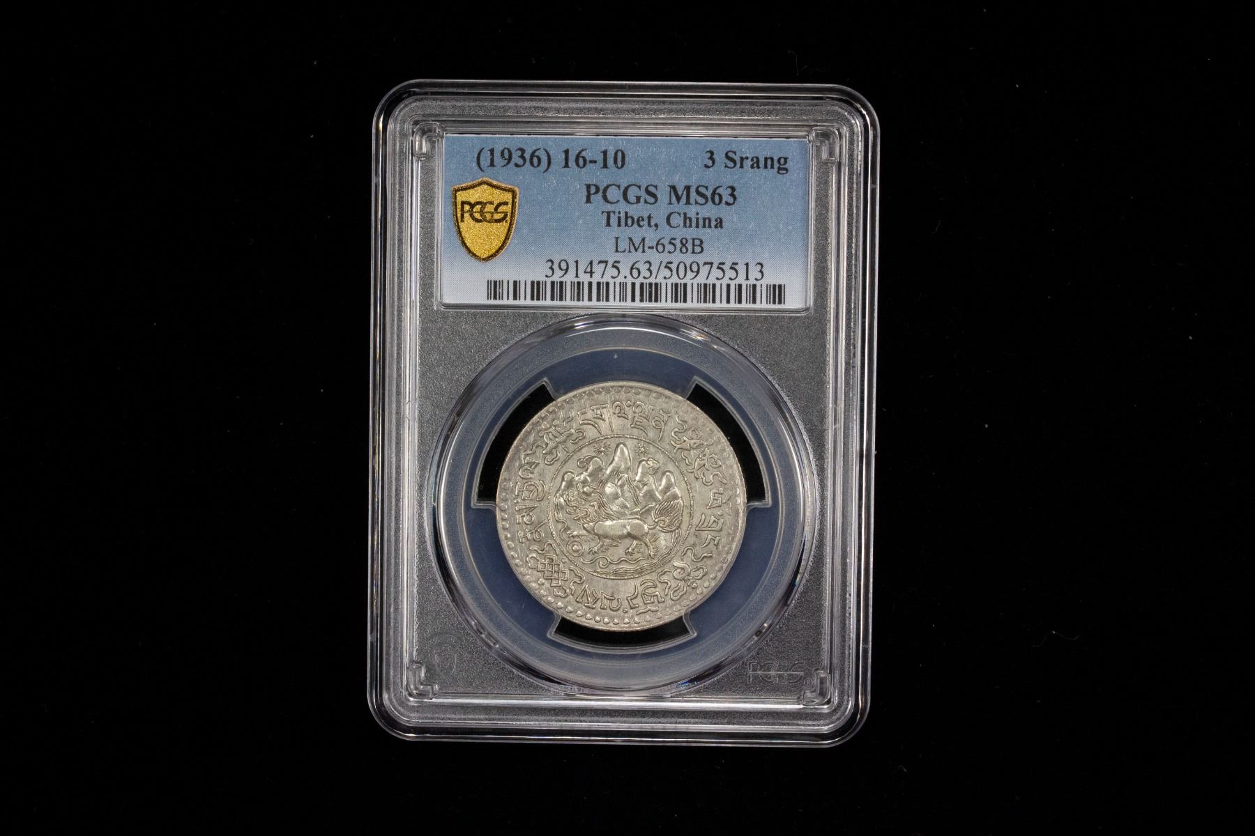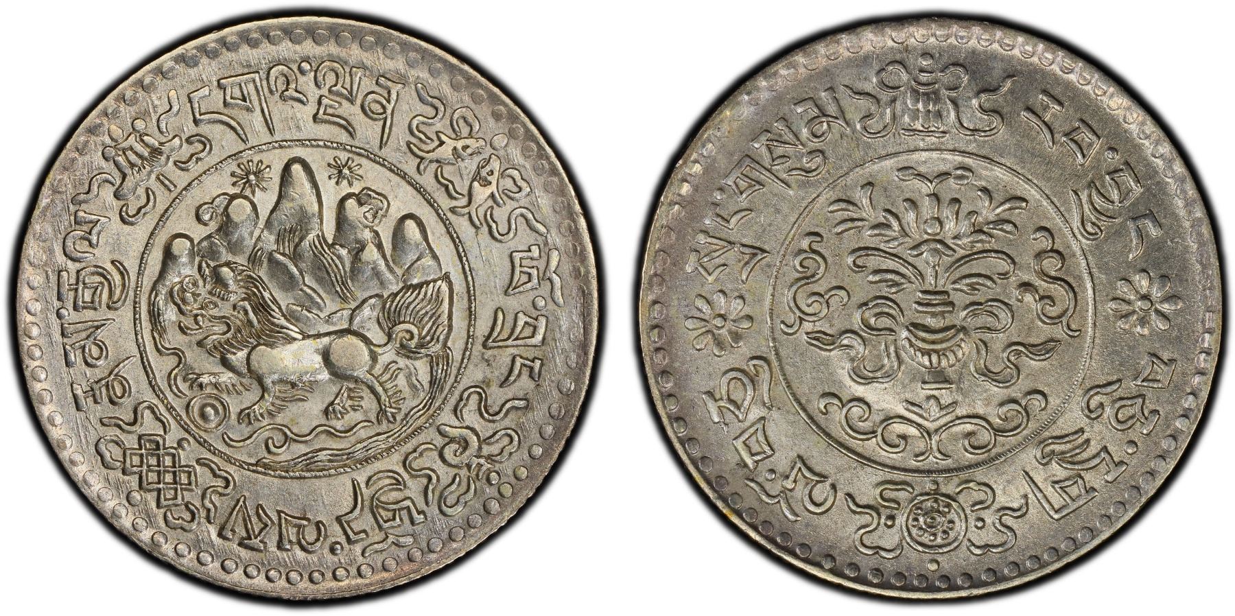 TIBET: AR 3 srang, BE16-10 (1936), Y-26, L&M-658B, Autonomous Tibetan issue, snow lion facing left before Mount Kailash with two suns in the background // Treasure vase (a Buddhist auspicious symbol) containing foliage with scroll ornaments around, all surrounded three Buddhist auspicious symbols (a victory banner, a dharma wheel, and a lotus flower) and Tibetan characters, a lovely mint state example! PCGS graded MS63, ex Almer H. Orr III Collection.