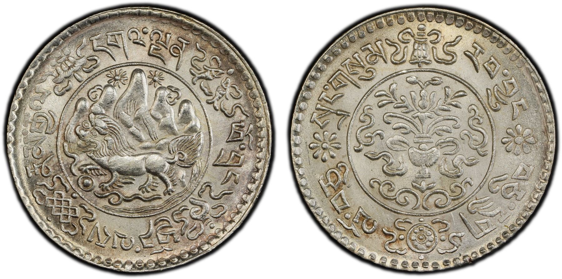 TIBET: AR 3 srang, BE16-10 (1936), Y-26, L&M-658B, Autonomous Tibetan issue, snow lion facing left before Mount Kailash with two suns in the background // Treasure vase (a Buddhist auspicious symbol) containing foliage with scroll ornaments around, all surrounded three Buddhist auspicious symbols (a victory banner, a dharma wheel, and a lotus flower) and Tibetan characters, a wonderful mint state example! PCGS graded MS64, ex Almer H. Orr III Collection.