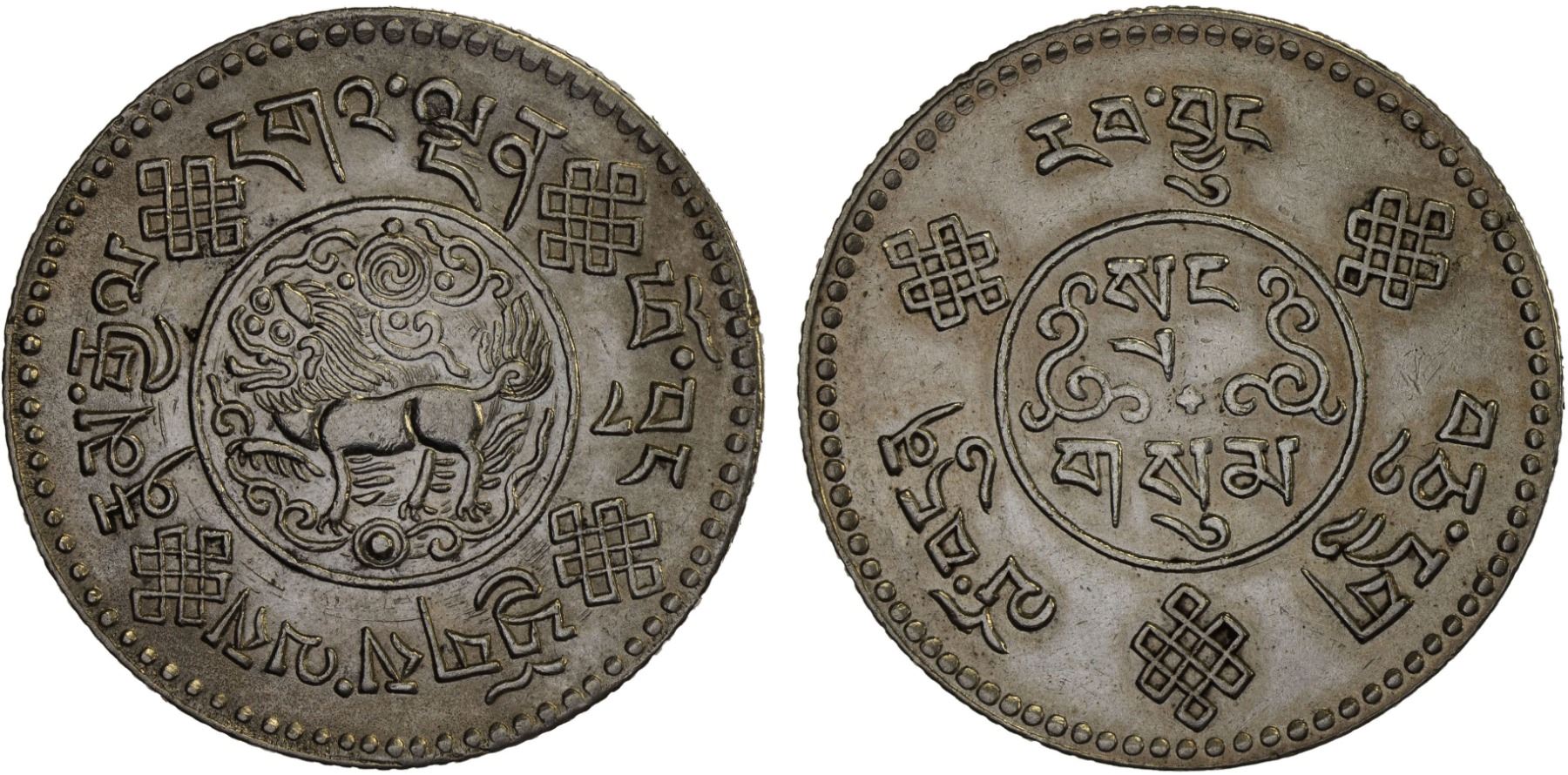 TIBET: AR 3 srang, BE16-7 (1933), Y-25, L&M-659, Autonomous Tibetan issue, snow lion facing left in center with ornaments above and below, harshly cleaned, XF-AU, ex Salvatore J. Falcone Collection.