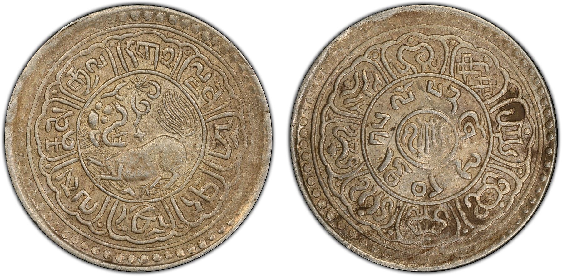 TIBET: AR 5 sho, BE15-52, Y-18.1, YZM-424, Autonomous Tibetan issue, snow lion looking backwards at sun with three ornaments, all within center circle of lotus flower, each of its eight petals containing a syllable of legend dga' ldan pho brang phyo(gs) las rnam rgyal ("The Ganden Palace, victorious in all directions") // triratna (triple gem) in center, rab byung 15 lo 52 zho lnga ("cycle 15, year 52, five sho") around, all within center circle of lotus flower, each of its eight petals containing a Buddhist auspicious symbol, a lovely example and very rare in near mint state condition, PCGS graded AU55.
