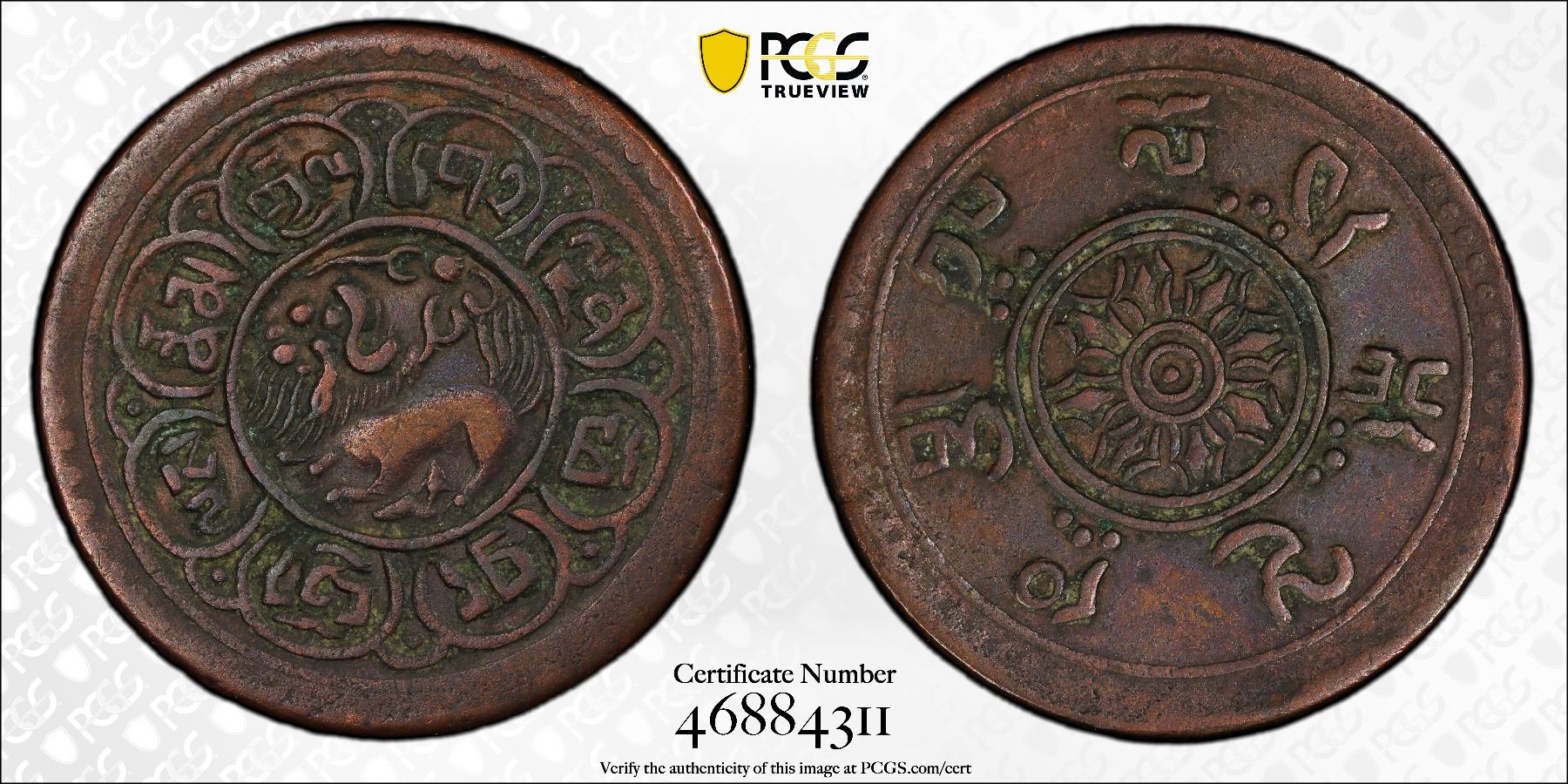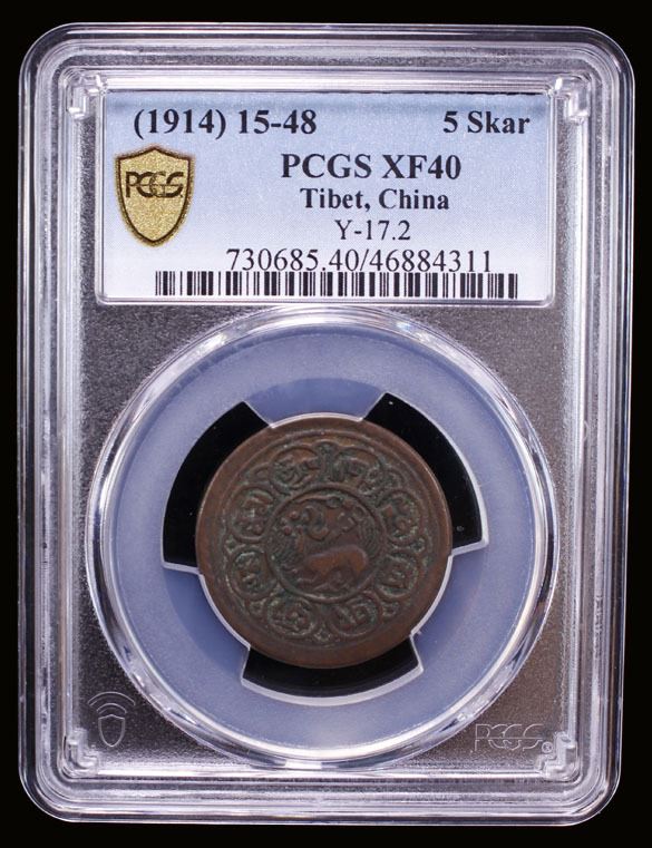TIBET: AR 5 skar, BE 15-48 (1914), Y-17.2, Autonomous Tibetan issue, snow lion crouching and looking upwards, surrounded by text translated "The Ganden Palace, victorious in all directions", PCGS graded EF40, ex SARC Internet Auction 24 Lot 854, ex The 1914 Collection. Tied for finest graded at NGC and PCGS.