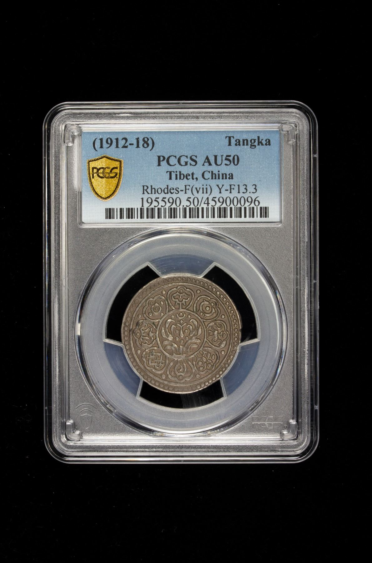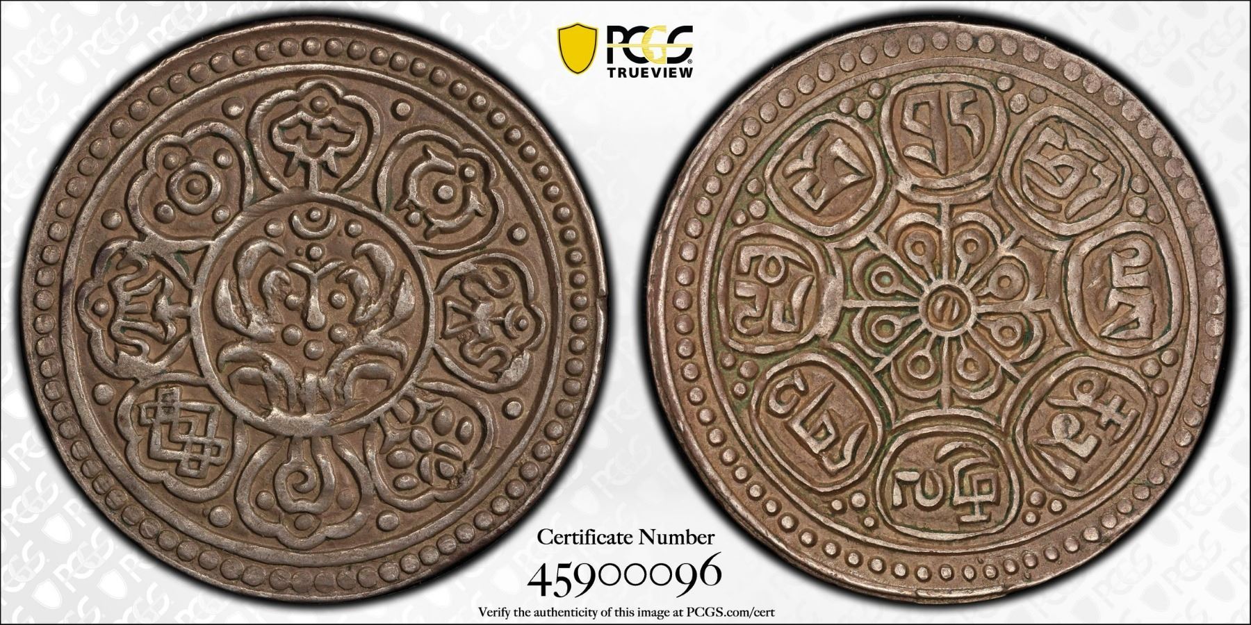 TIBET: AR ga-den tangka (4.09g), ND (1912-18), Y-F13.3, Rhodes-F(vii), PCGS graded AU50. The obverse of the ga-den tangkas show the eight auspicious symbols of Tibetan Buddhism: umbrella of sovereignty, two golden fish of good fortune, amphora of ambrosia, lotus, conch shell, emblem of endless rebirth, banner of victory and wheel of empire. These are usually arrayed around a central lotus. Their actual order and specific designs varied over time. The two sides of the coin have the same orientation. Starting from the top, the legend in Tibetan on the reverse says: dga'-ldan pho-brang-phyod-las-rnam-rgyal (The Palace of Ga-den is victorious in all directions). The legend is written in such a way as to fit into eight circles.