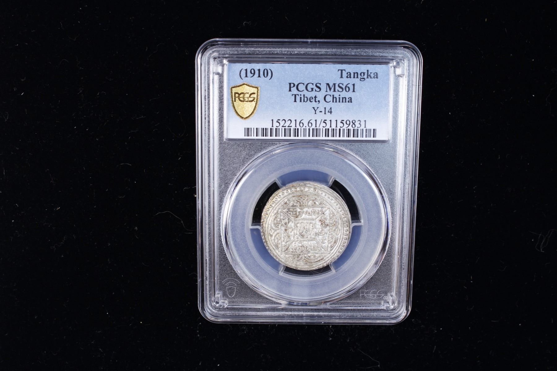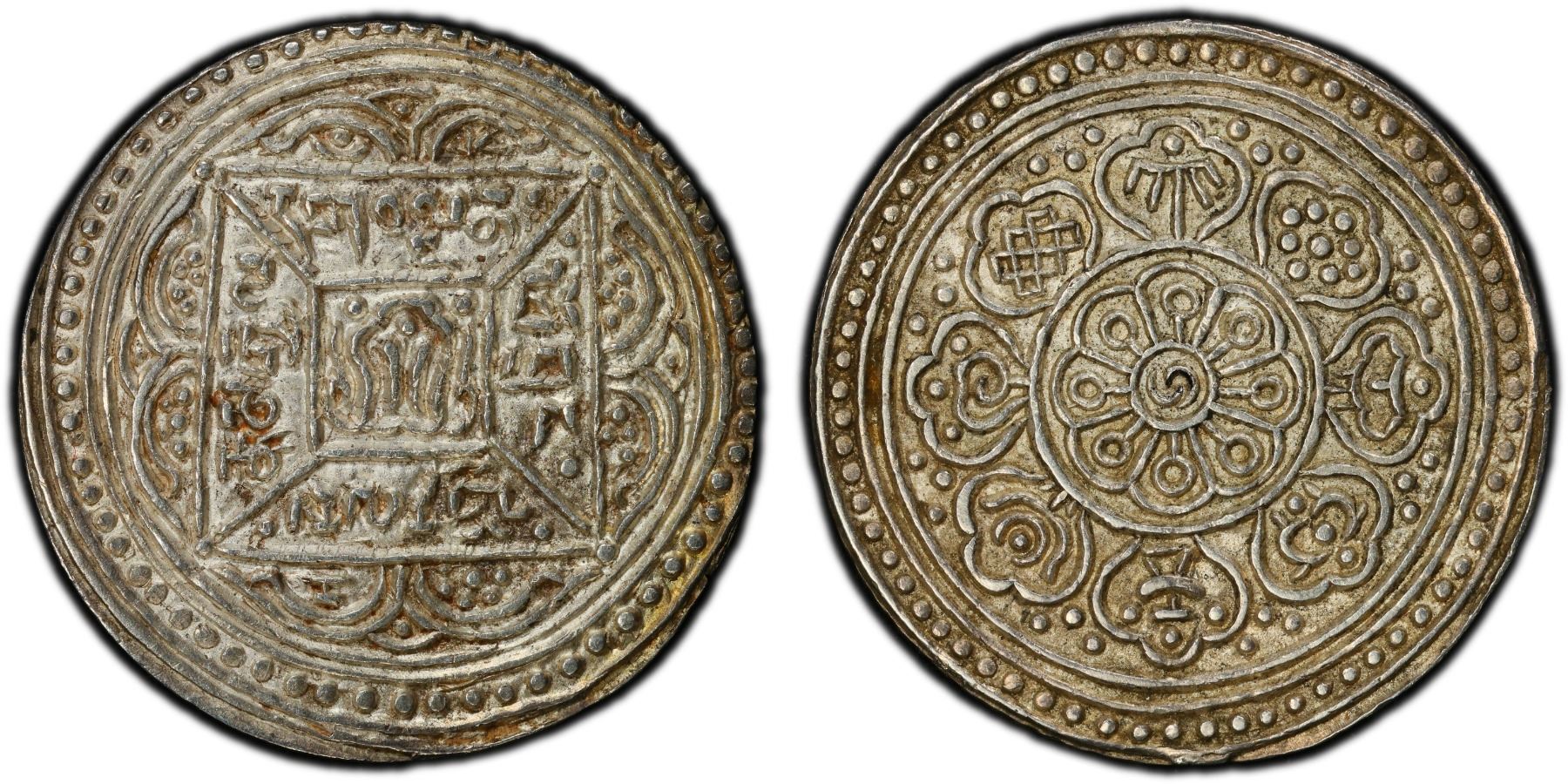 TIBET: AR kelzang tangka (3.65g), ND (1910), Y-14, square in square type, PCGS graded MS61. This special tangka, struck in better silver than the normal ga-den tangkas, was distributed to monks during the Monlam Festival ("Great Prayer" Festival) in early 1910. The distribution most probably took place in the Kelzang Palace, which is located in the Norbulingka, the park and summer palaces of the Dalai Lamas in Lhasa.