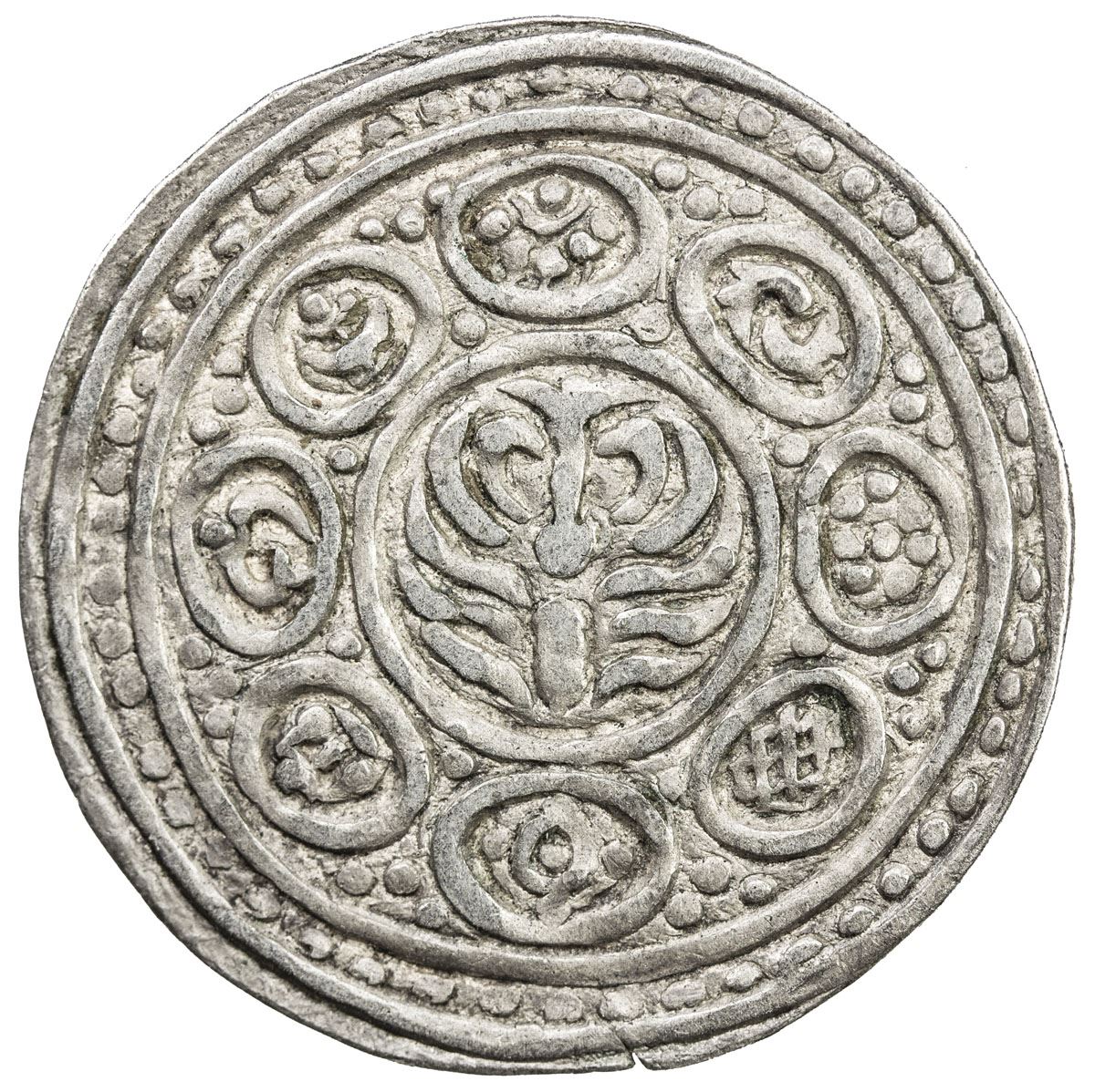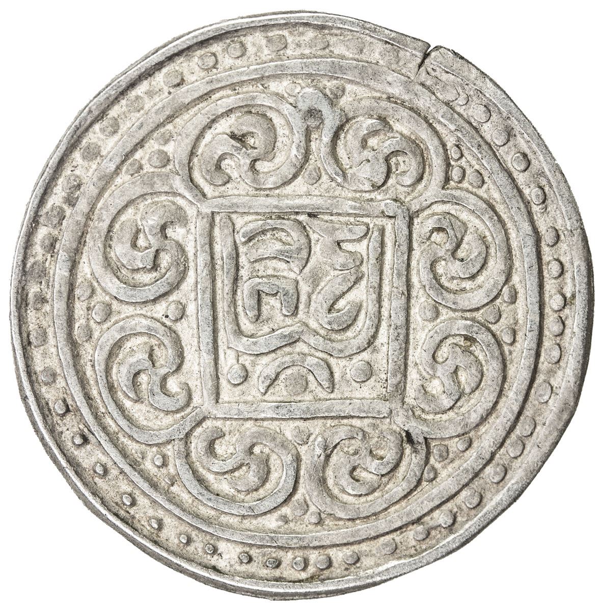 TIBET: AR kong-par tangka (4.05g), year 15-24 (1890), Y-A13.1, eight auspicious symbols of the Tibetan Buddhism, which surround a lotus in the inner circle // inner square with the date inside, EF. A fourth series of Kong Par tangkas was struck in 1890 and 1891; this time the coins bear a new date which corresponds to the actual year when they were struck, i.e., 15-24 and 15-25. They were struck at a reduced weight standard.