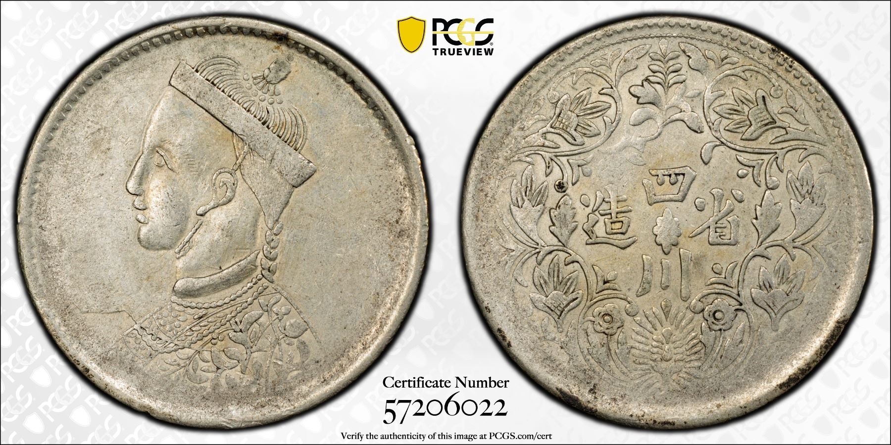 TIBET: AR rupee, Chengdu, ND (1911-33), Y-3.2, L&M-359, Szechuan-Tibet trade issue, small portrait of the Chinese emperor Guang Xu with collar, derived from the British Indian rupee of Queen Victoria // vertical rosette at center, Chinese inscription, si chuan sheng zao ("made in Sichuan"), branches with cusps and flowers around, a feature also derived from the reverse of British Indian rupees, PCGS graded EF45.
