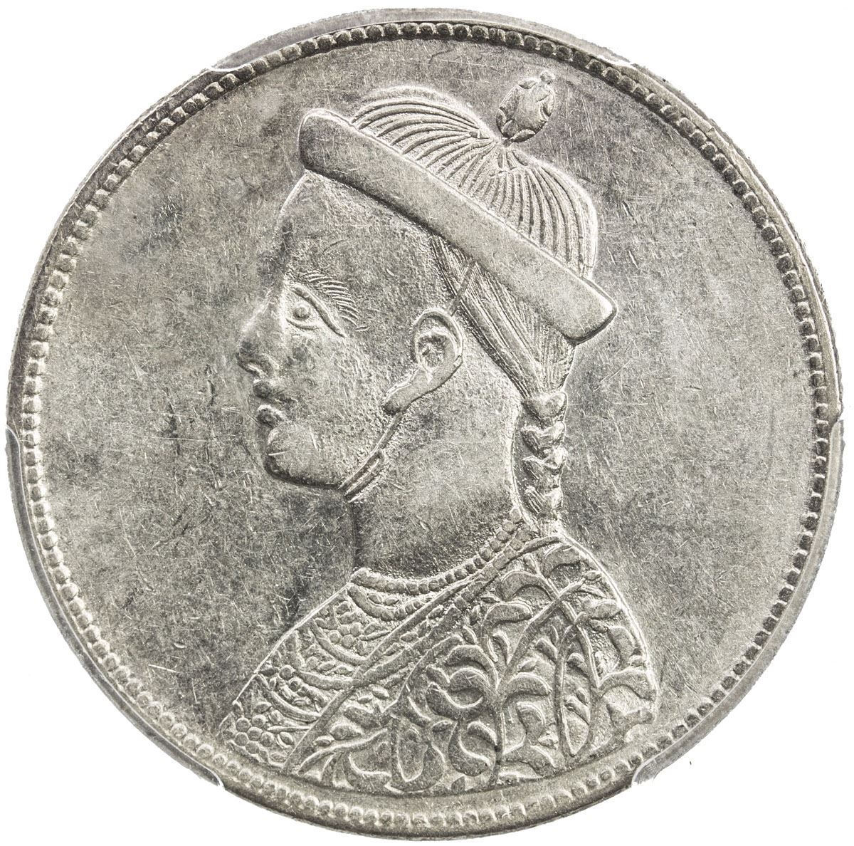 TIBET: AR rupee, Chengdu mint, ND (1902-11), Y-3.1, L&M-358, Szechuan-Tibet trade issue, small portrait of the Chinese emperor Guang Xu without collar, derived from the British Indian rupee of Queen Victoria // horizontal rosette at center, Chinese inscription, si chuan sheng zao ("made in Sichuan"), branches with cusps and flowers around, a feature also derived from the reverse of British Indian rupees, PCGS graded AU55. The Sichuan rupees of this type from the Chengdu mint ranged from .880 to .935 fine silver.
