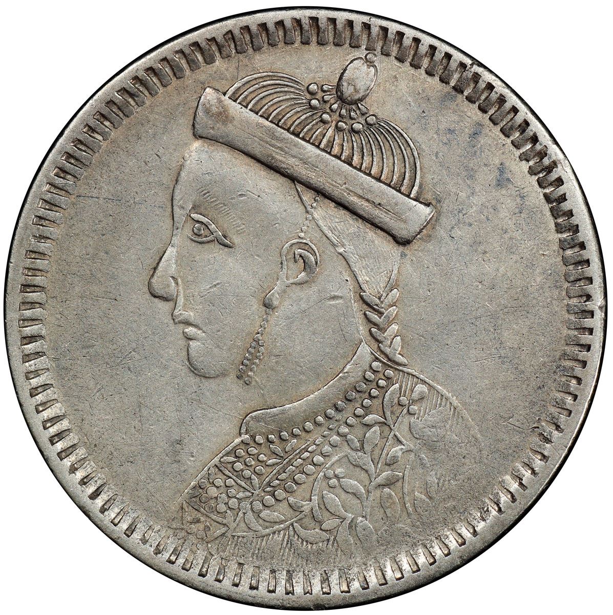 TIBET: AR rupee, Chengdu mint, ND (1911-33), Y-3.2, L&M-359, Szechuan-Tibet trade issue, small portrait of the Chinese emperor Guang Xu with collar, derived from British Indian rupee of Queen Victoria // vertical rosette at center, Chinese inscription, si chuan sheng zao ("made in Sichuan"), branches with cusps and flowers around, a feature also derived from the reverse of British Indian rupees, PCGS graded EF45.