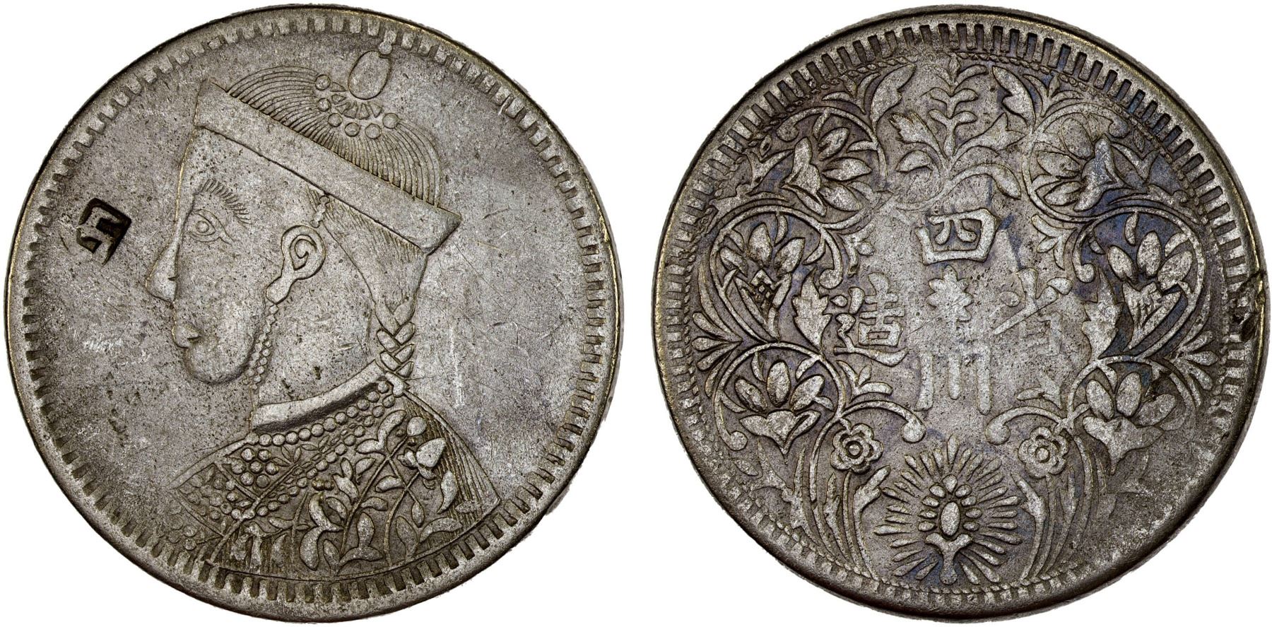 TIBET: AR rupee, Kanding, ND (1939-42), Y-3.3, Szechuan-Tibet trade issue, large portrait of the Chinese emperor Guang Xu with collar // Chinese inscription si chuan sheng zao ("made in Sichuan"), vertical rosette at center, "5"-shaped countermark on obverse, VF. Sichuan rupees are occasionally found with countermarks in Tibetan and/or Chinese script and marks consisting of Western numerals or the English word "one." The meaning of most of these marks remains uncertain, but we can presume that they were applied to the coins by local authorities, such as monasteries or dzong dpon (district officials) in order to enforce the circulation of the Sichuan rupees made of low grade silver in a specific area of Tibet.