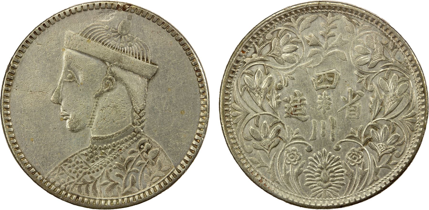 TIBET: AR rupee, Kangding, ND (1939-42), Y-3.3, Szechuan-Tibet trade issue, large portrait of the Chinese emperor Guang Xu with collar, derived from the British Indian rupee of Queen Victoria // vertical rosette at center, Chinese inscription si chuan sheng zao ("made in Sichuan"), branches with cusps and flowers around, lightly cleaned, VF-EF. The Sichuan rupees of this type from the Kangding Mint were struck in debased silver ranging from .420 to .500 fine silver.