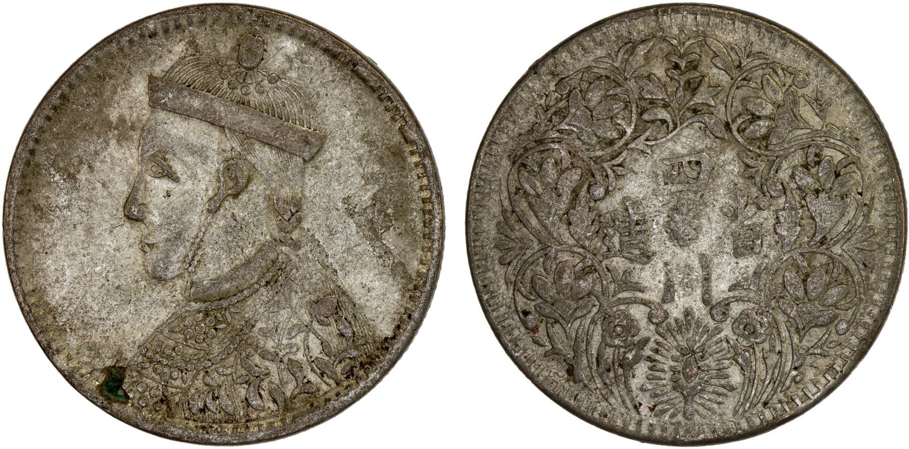 TIBET: AR rupee, Kangding, ND (1939-42), Y-3.3, Szechuan-Tibet trade issue, large portrait of the Chinese emperor Guang Xu with collar // Chinese inscription si chuan sheng zao ("made in Sichuan"), vertical rosette at center, VF-XF.