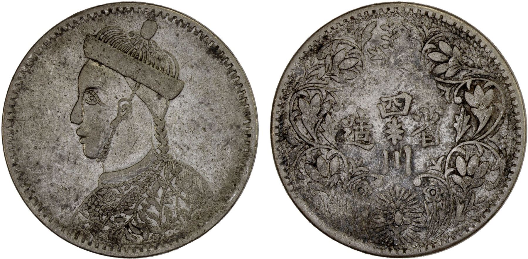 TIBET: AR rupee, Kangding, ND (1939-42), Y-3.3, Szechuan-Tibet trade issue, large portrait of the Chinese emperor Guang Xu with collar // Chinese inscription si chuan sheng zao ("made in Sichuan"), vertical rosette at center, VF.