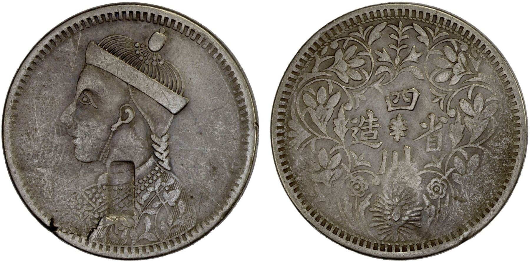 TIBET: AR rupee, Kangding, ND (1939-42), Y-3.3, Szechuan-Tibet trade issue, large portrait of the Chinese emperor Guang Xu with collar derived from the British Indian rupee of Queen Victoria // vertical rosette at center, Chinese inscription, si chuan sheng zao ("made in Sichuan"), branches with cusps and flowers around, with weakly struck Chinese and Tibetan countermark li yong lam within rectangular depression, VF. The meaning of most of these marks remains uncertain, but we can presume that they were applied to the coins by local authorities, such as monasteries or dzong dpon (district officials) in order to enforce the circulation of the Sichuan rupees made of low grade silver in a specific area of Tibet.