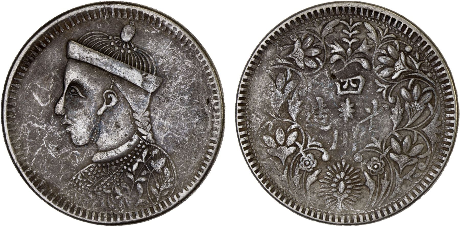 TIBET: AR rupee, Kangding, ND (1939-42), Y-3.3, Szechuan-Tibet trade issue, large portrait of the Chinese emperor Guang Xu with collar // vertical rosette at center, Chinese inscription, si chuan sheng zao ("made in Sichuan"), branches with cusps and flowers around, harsh cleaning scratches, VF.