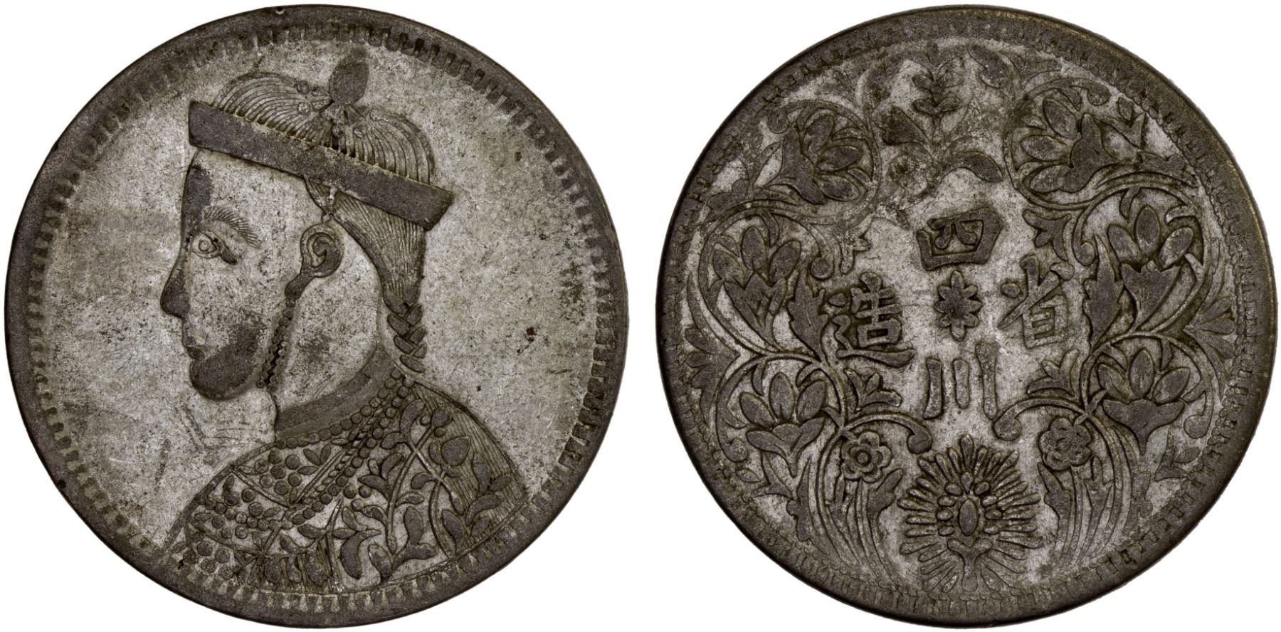 TIBET: AR rupee, Kangding, ND (1939-42), Y-3.3, Szechuan-Tibet trade issue, large portrait of the Chinese emperor Guang Xu with collar // vertical rosette at center, Chinese inscription, si chuan sheng zao ("made in Sichuan"), branches with cusps and flowers around, harsh cleaning scratches, VF.