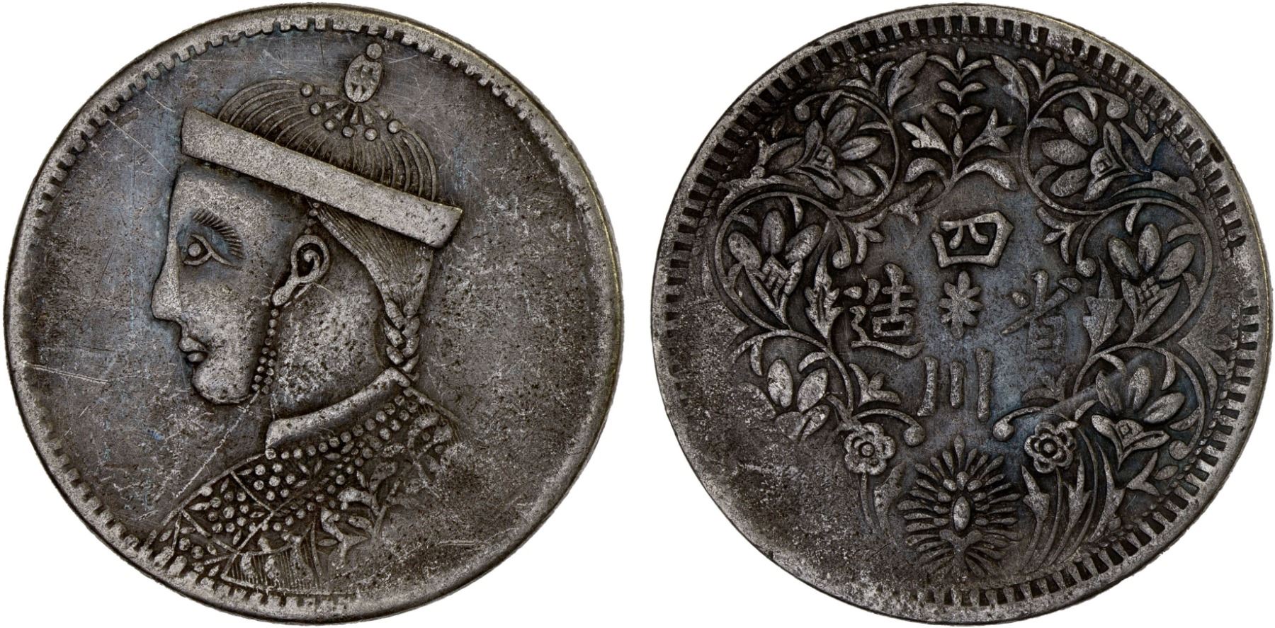 TIBET: AR rupee, Kangding, ND (1939-42), Y-3.3, Szechuan-Tibet trade issue, large portrait of the Chinese emperor Guang Xu with collar // vertical rosette at center, Chinese inscription, si chuan sheng zao ("made in Sichuan"), branches with cusps and flowers around, harsh cleaning scratches, VF.