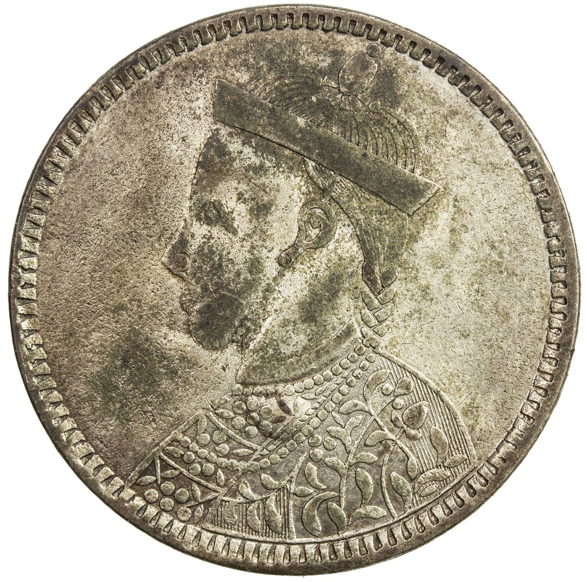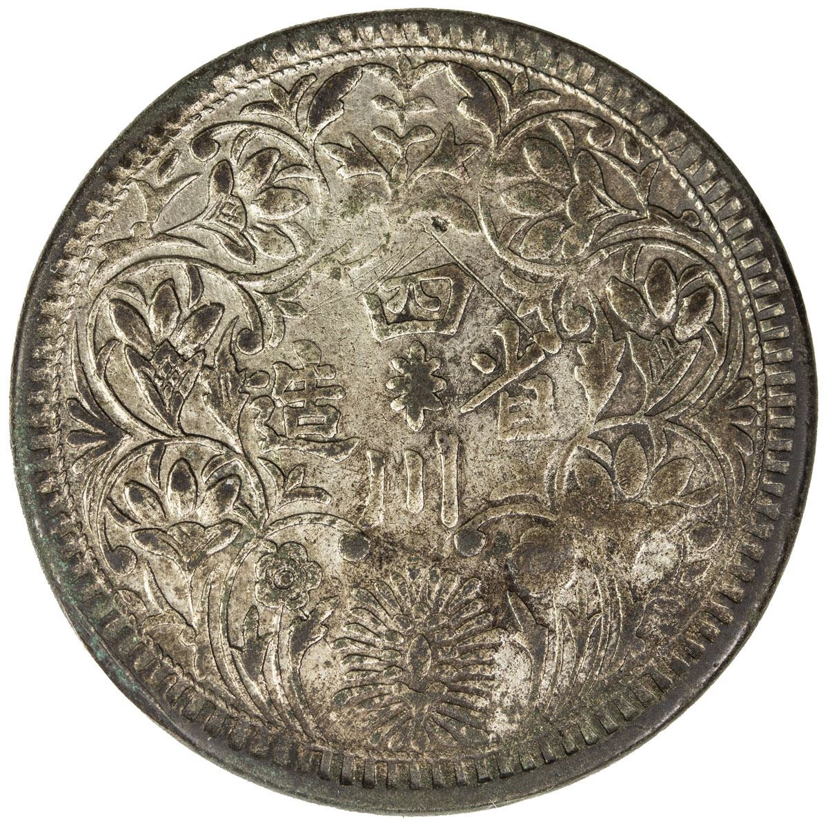 TIBET: AR rupee, Kangding mint, ND (1939-42), Y-3.3, L&M-359, Szechuan-Tibet trade issue, large portrait of the Chinese emperor Guang Xu with collar, derived from the British Indian rupee of Queen Victoria // vertical rosette at center, Chinese inscription, si chuan sheng zao ("made in Sichuan"), branches with cusps and flowers around, a feature also derived from the reverse of British Indian rupees, couple light reverse scratches, AU. The Sichuan rupees were struck in Kangding of an alloy of debased silver ranging from .420 to .605 fine silver.