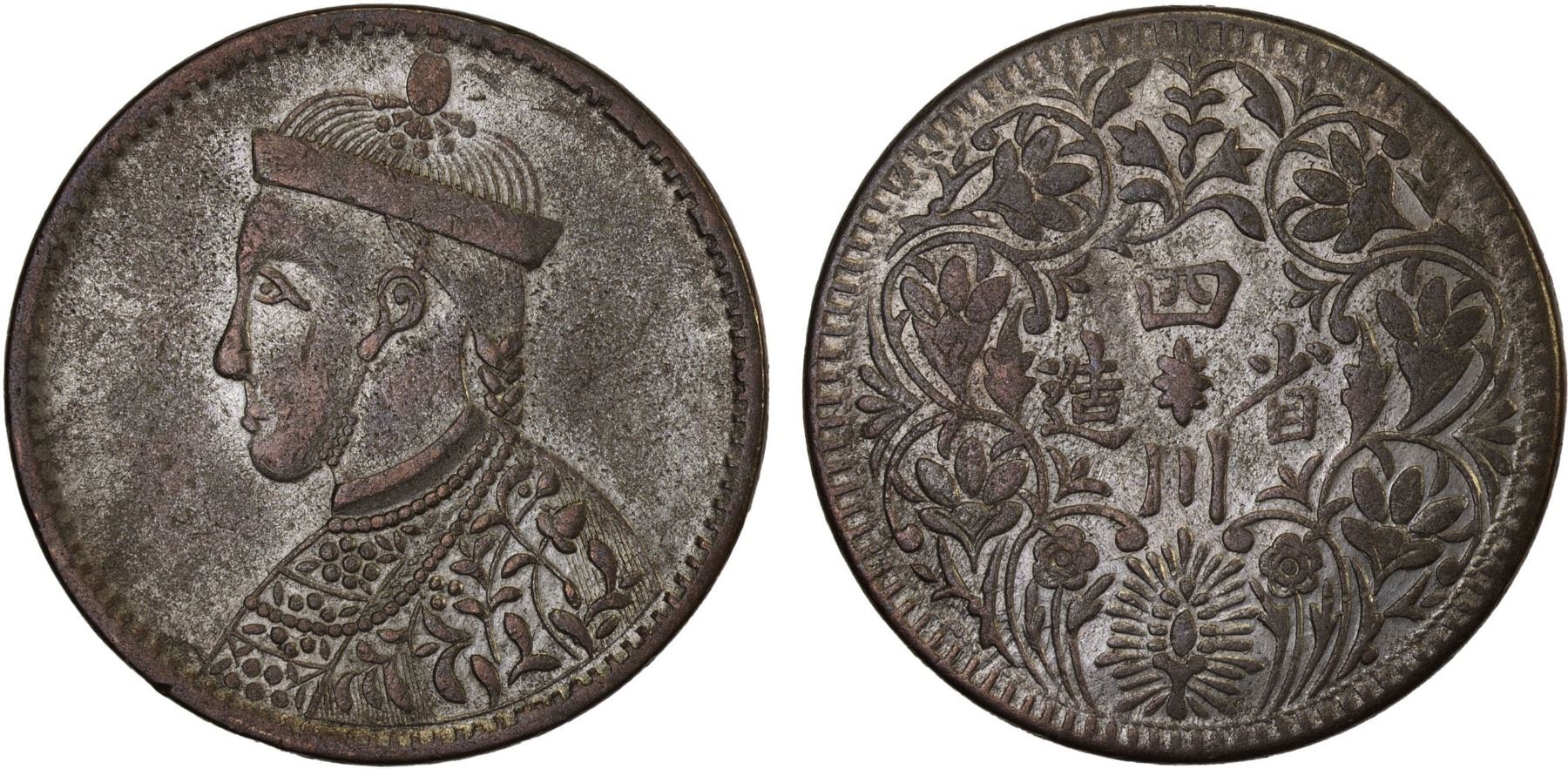 TIBET: AR rupee, ND (1911-33), Y-3.2, Szechuan-Tibet trade issue, small portrait of the Chinese emperor Guang Xu with collar // vertical rosette at center, Chinese inscription si chuan sheng zao ("made in Sichuan"), F-VF, ex Frank S. Robinson Collection. The Sichuan rupees of this type from the Chengdu Mint ranged from .700 to .740 fine silver.