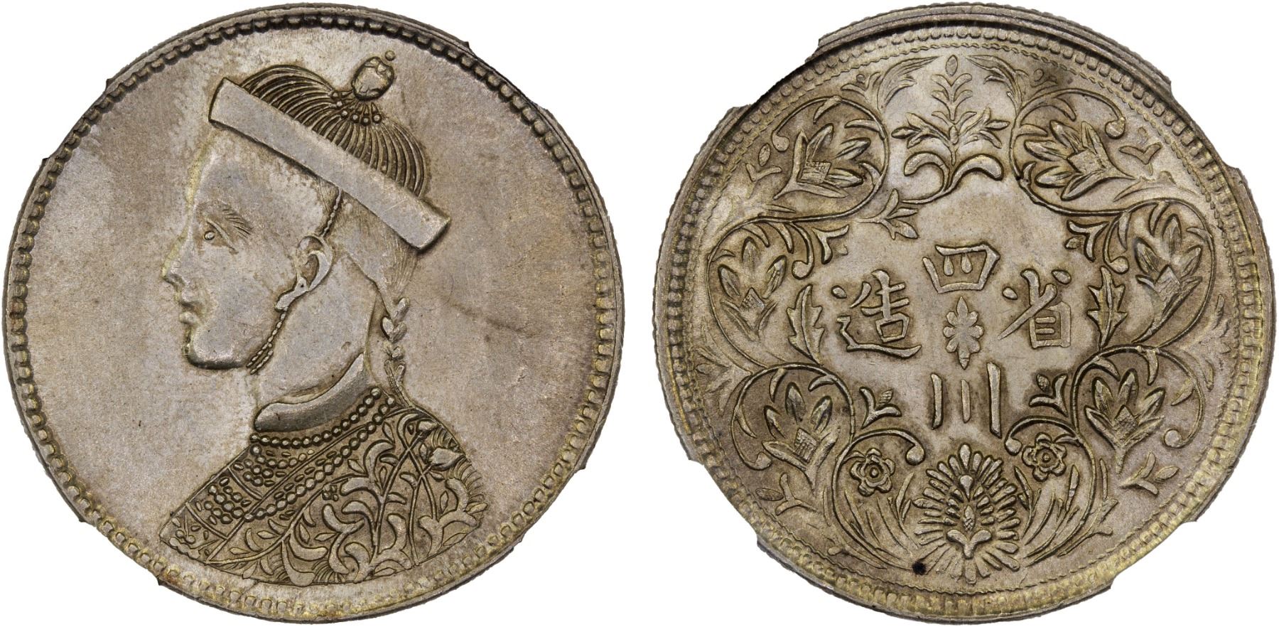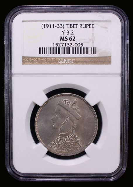 TIBET: AR rupee, ND (1911-33), Y-3.2, L&M-359, Szechuan-Tibet trade issue, small portrait of the Chinese emperor Guang Xu with collar, derived from the British Indian rupee of Queen Victoria // vertical rosette at center, Chinese inscription, si chuan sheng zao ("made in Sichuan"), branches with cusps and flowers around, a feature also derived from the reverse of British Indian rupees, lustrous, great eye appeal for this type, NGC graded MS62, ex The 1914 Collection. The Sichuan rupees of this type from the Chengdu Mint ranged from .700 to .740 fine silver.