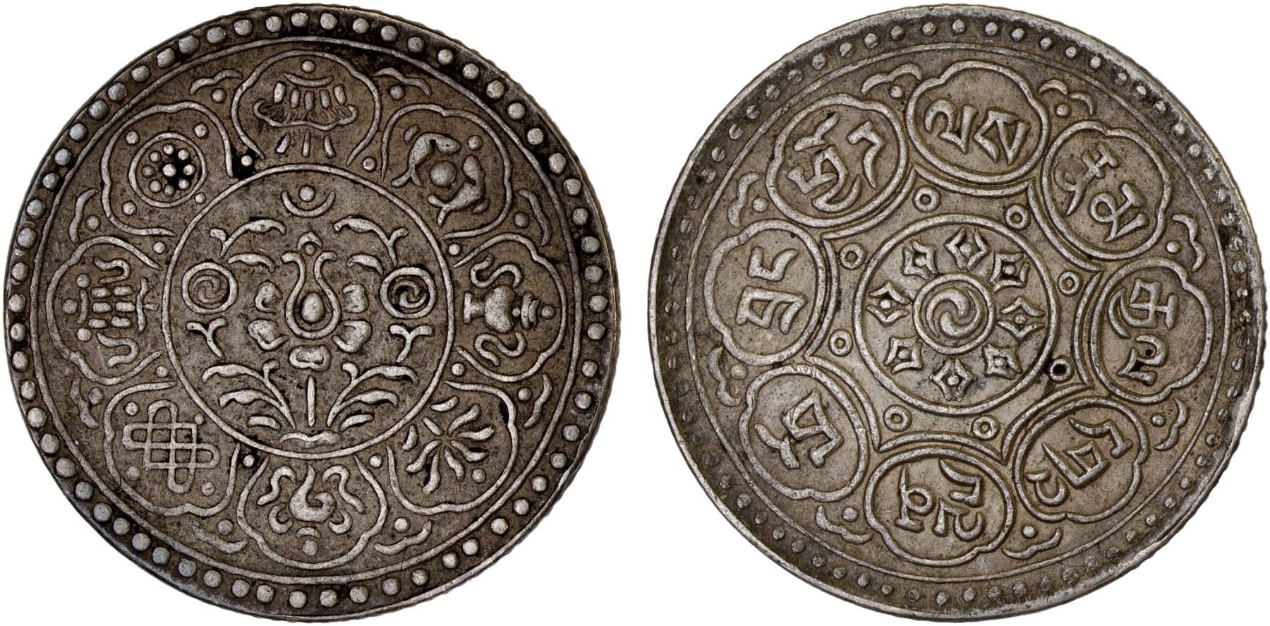 TIBET: AR tangka dkarpo sa rpa (3.90g), ND (1953-54), Y-31, Second Monk issue, Choice XF. Traditionally, it is believed that these tangkas were distributed to monks on behalf of the 14th Dalai Lama in the late 1940s. The Tibetans referred to this type as Tangka dkarpo sa rpa ("new white tangka") in order to distinguish it from the normal gaden tangkas. This coin circulated for some time at the value of 5 srang which shows the high inflation rate which was prevailing in Tibet in the 20th Century. In the 19th Century 6 1/2 tangkas were equivalent to 1 srang which corresponded to slightly more than 37 grams of silver. Taking the circulating value of this "Monk" tangka as a base, 1 srang was equal to about 33 1/2 tangkas in 1953-54.