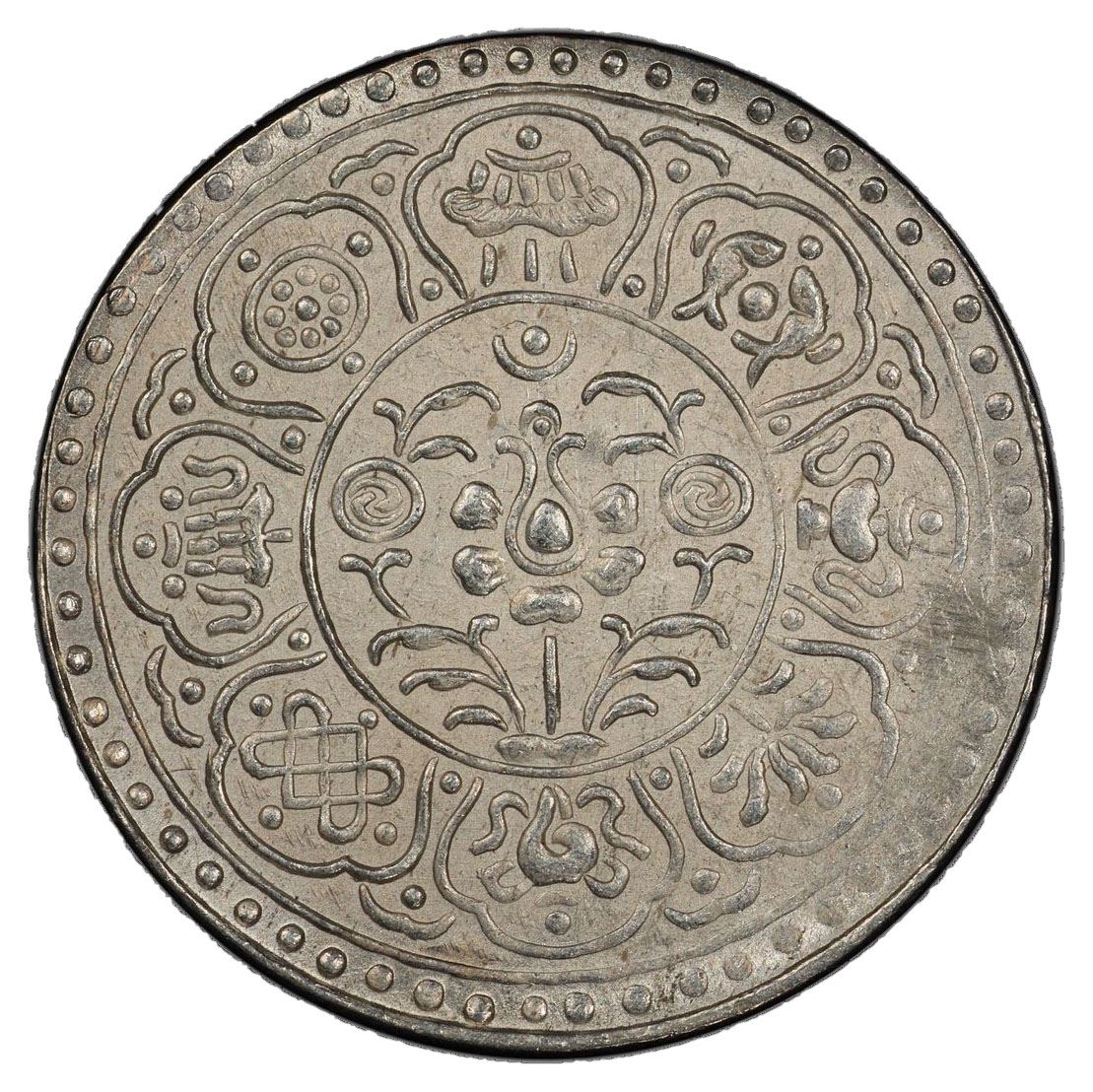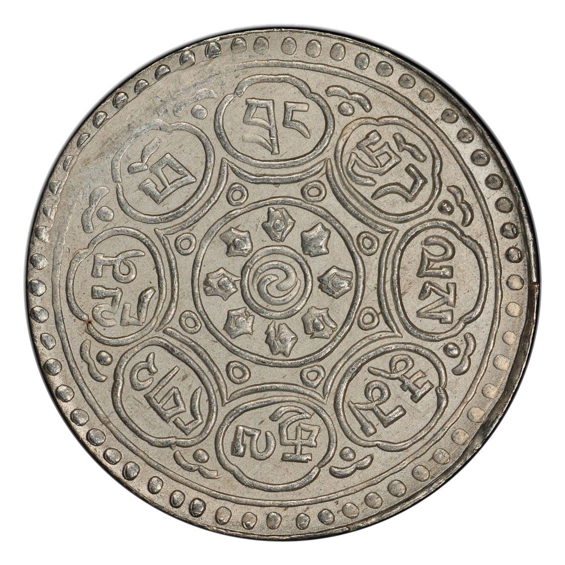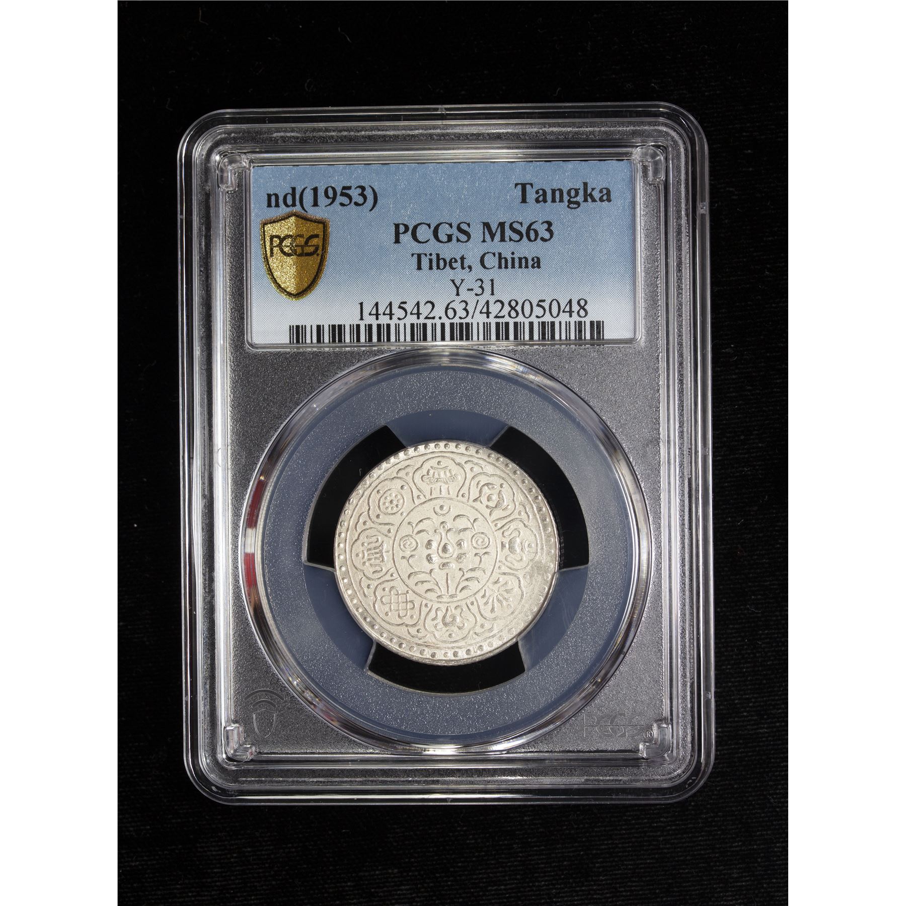 TIBET: AR tangka dkarpo sa rpa, ND (1953), Y-31, Second Monk issue, a lovely mint state example! PCGS graded MS63. Formerly it was assumed that these tangkas were distributed to monks on behalf of the 14th Dalai Lama in the late 1940s. The Tibetans referred to this Tangka as Tangka dkarpo sa rpa ("new white tangka") in order to distinguish it from the normal ga-den tangkas. This coin circulated for some time at the value of 5 srang, which shows the high inflation rate which was prevailing in Tibet in the 20th Century. In the 19th Century 6½ tangkas were equivalent to 1 srang which corresponded to slightly more than 37 grams of silver. Taking the circulating value of this "Monk" tangka as a base, 1 srang was equal to about 33½ tangkas in 1953-54.