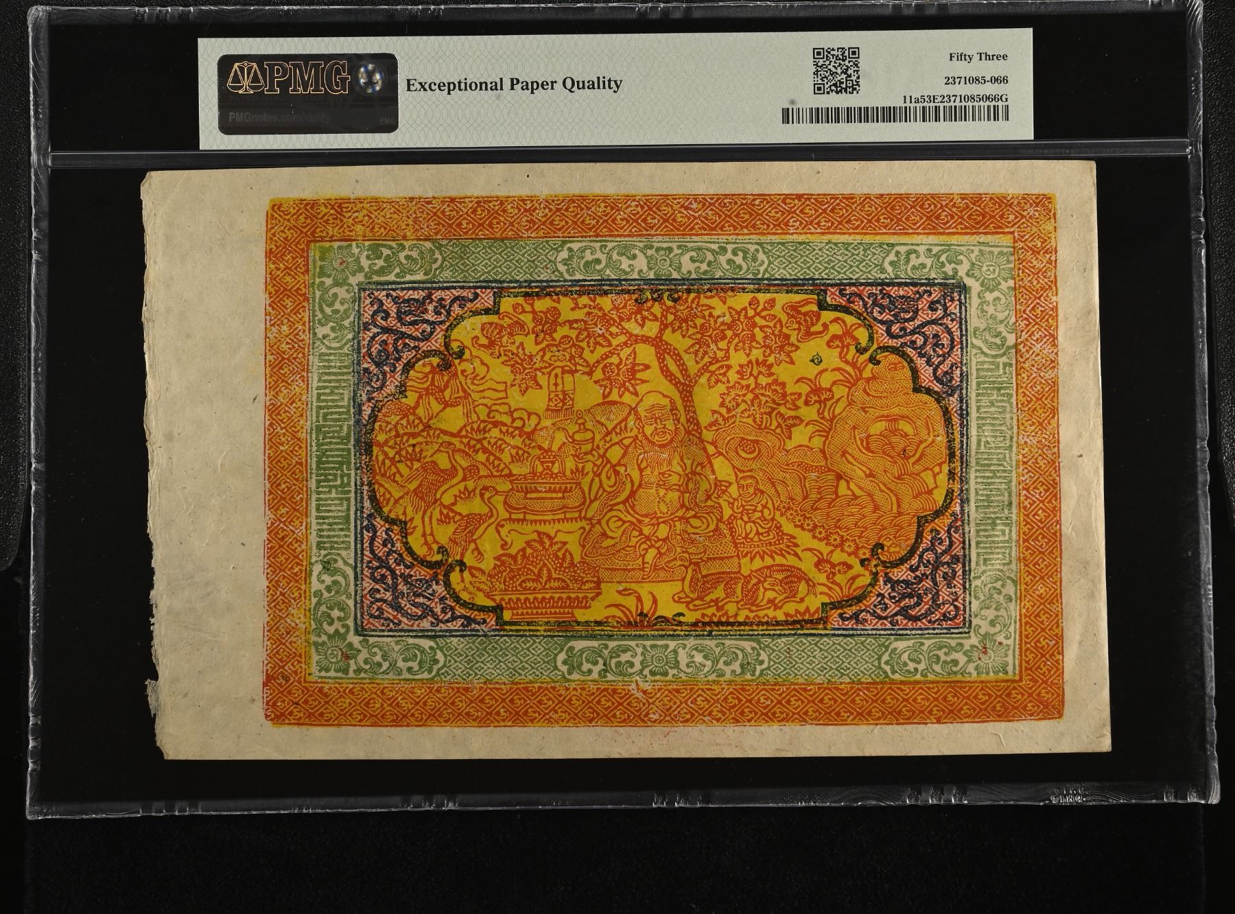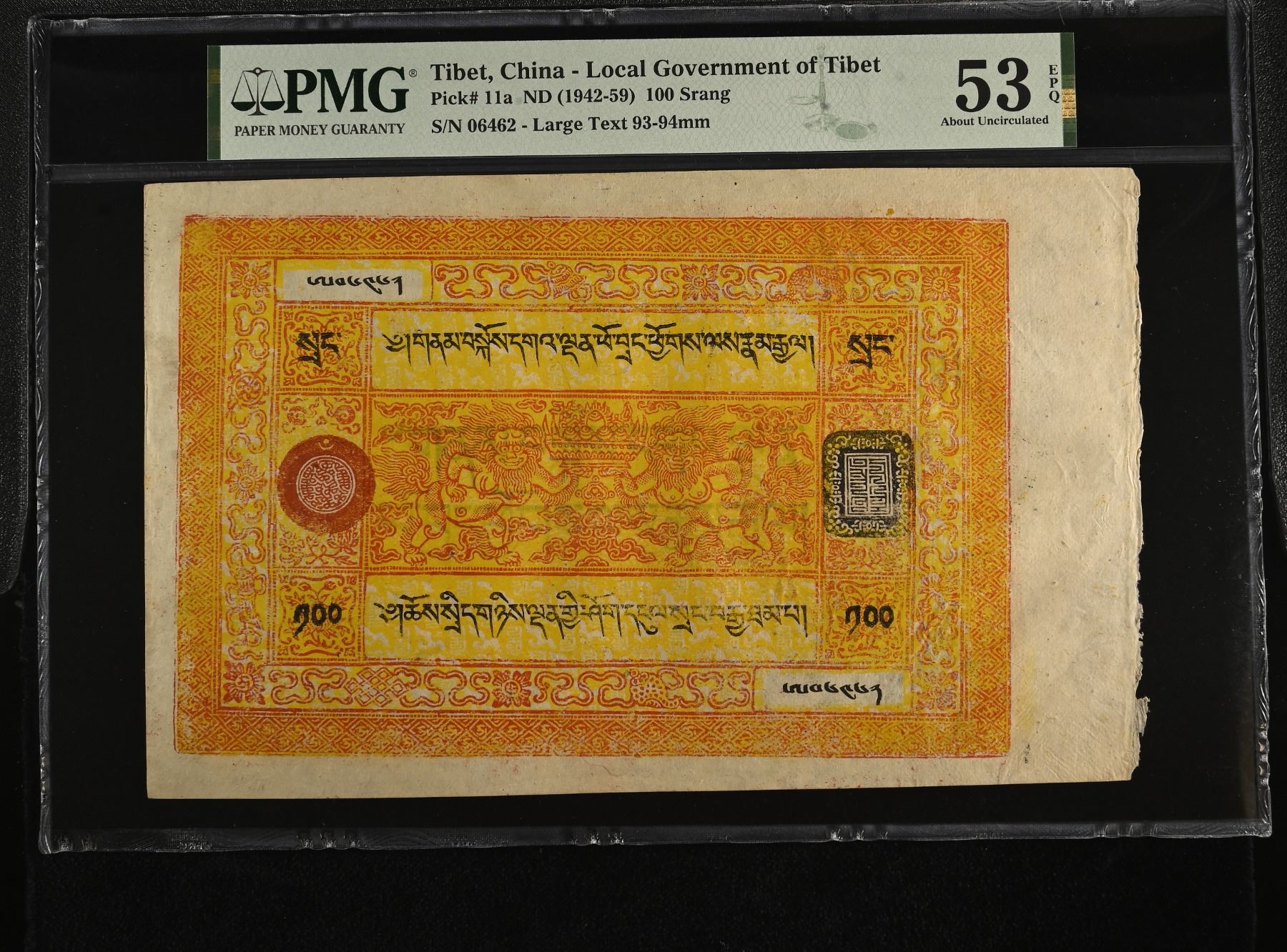 TIBET: Autonomous Tibetan Issue, 100 srang, ND (1942-59), Pick-11a, 135x217mm note, variety with large text, orange on yellow underprint, two lions with fruit bowl at center, red and black validation seals, serial number 06462, PMG graded AU53 EPQ, ex George Anderson Collection; ex Stacks, Bowers & Ponterio April 2017 Hong Kong Auction, Lot 70639 (part); ex Sir Alexander B. Lissanevitch Collection. From a group of 25 notes that have consecutive serial numbers. They were bought in Hong Kong as a single lot in the Stack's sale.