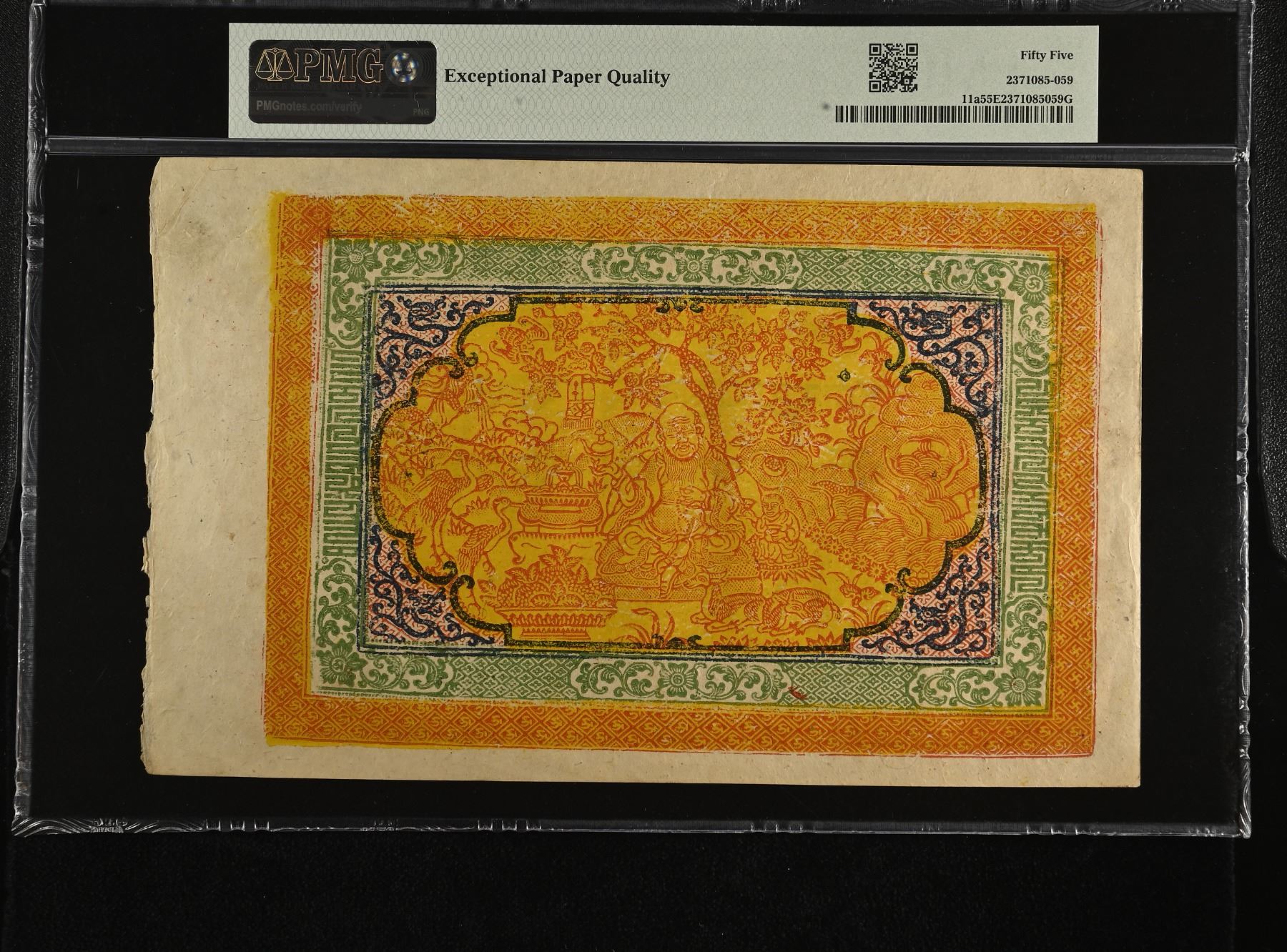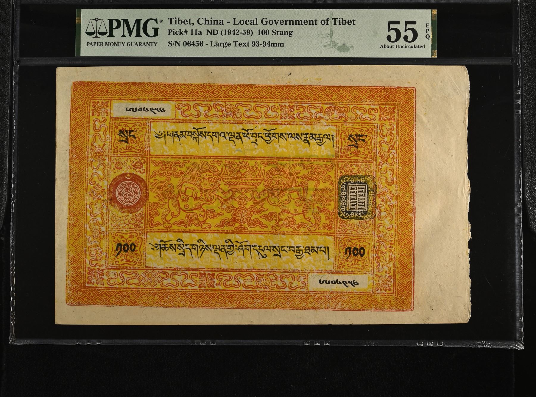 TIBET: Autonomous Tibetan Issue, 100 srang, ND (1942-59), Pick-11a, 135x216mm note, variety with large text, orange on yellow underprint, two lions with fruit bowl at center, red and black validation seals, serial number 06456, PMG graded AU55 EPQ, ex George Anderson Collection; ex Stacks, Bowers & Ponterio April 2017 Hong Kong Auction, Lot 70639 (part); ex Sir Alexander B. Lissanevitch Collection. From a group of 25 notes that have consecutive serial numbers. They were bought in Hong Kong as a single lot in the Stack's sale.
