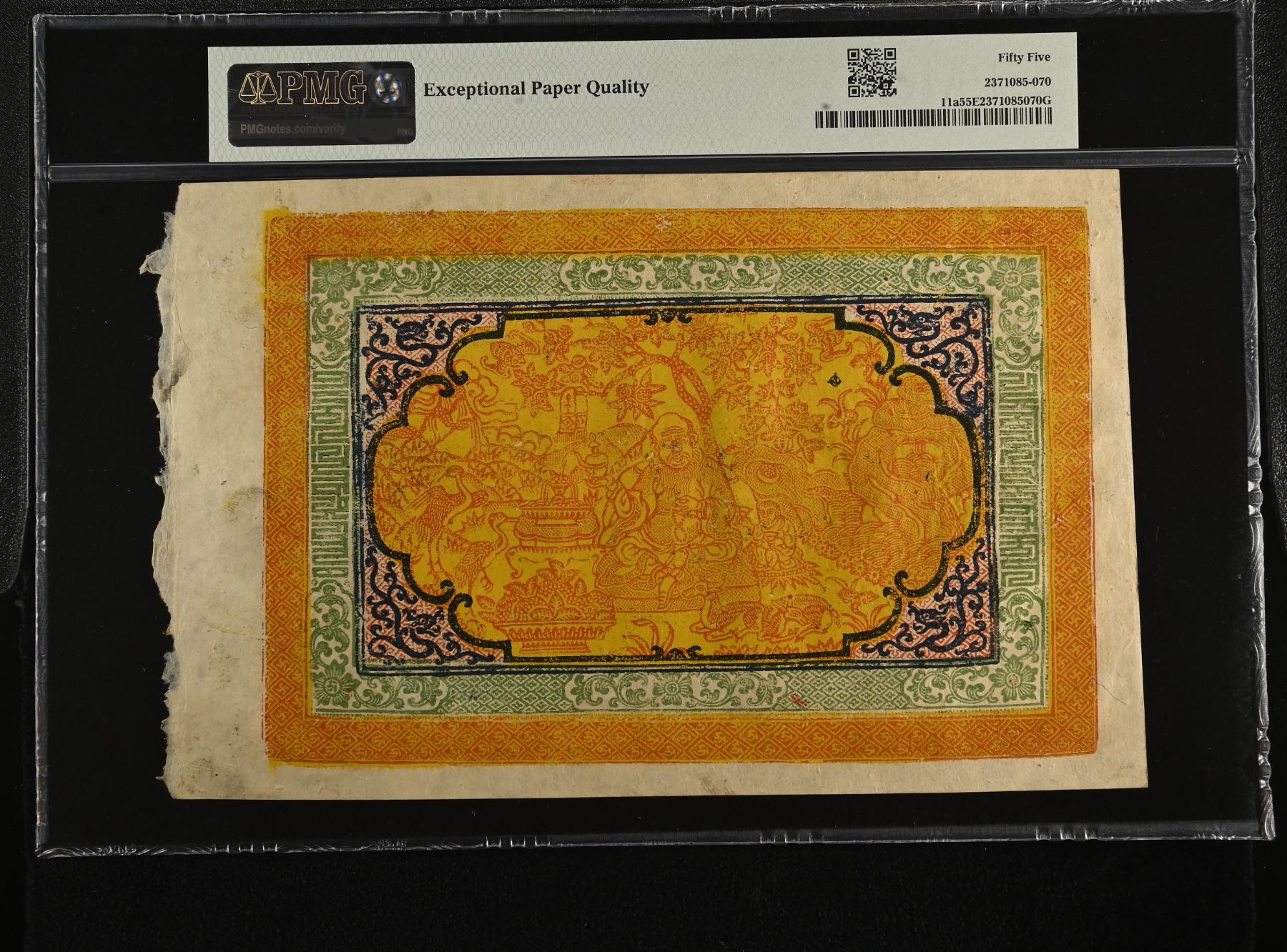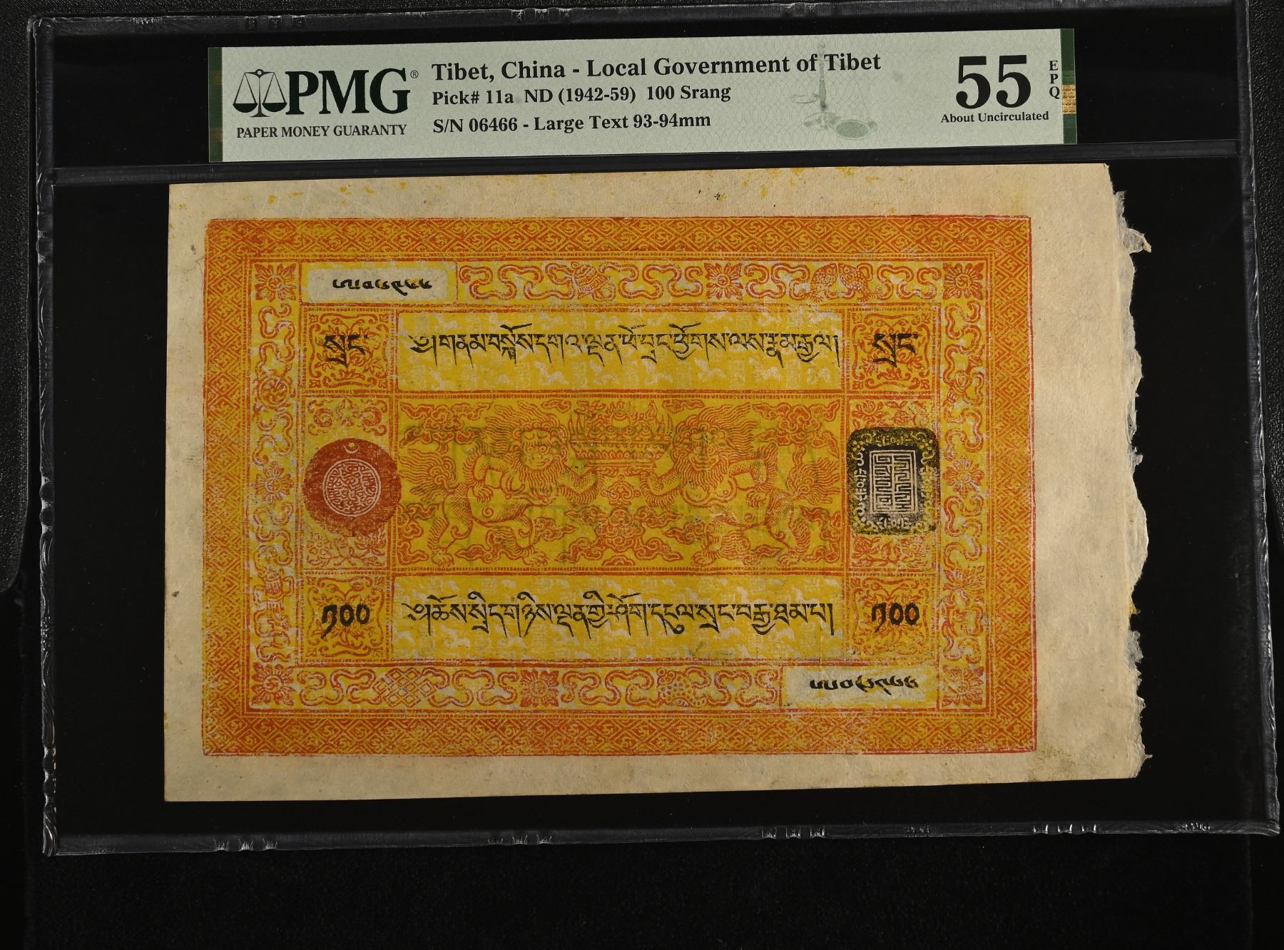 TIBET: Autonomous Tibetan Issue, 100 srang, ND (1942-59), Pick-11a, 136x212mm note, variety with large text, orange on yellow underprint, two lions with fruit bowl at center, red and black validation seals, serial number 06466, PMG graded AU55 EPQ, ex George Anderson Collection; ex Stacks, Bowers & Ponterio April 2017 Hong Kong Auction, Lot 70639 (part); ex Sir Alexander B. Lissanevitch Collection. From a group of 25 notes that have consecutive serial numbers. They were bought in Hong Kong as a single lot in the Stack's sale.