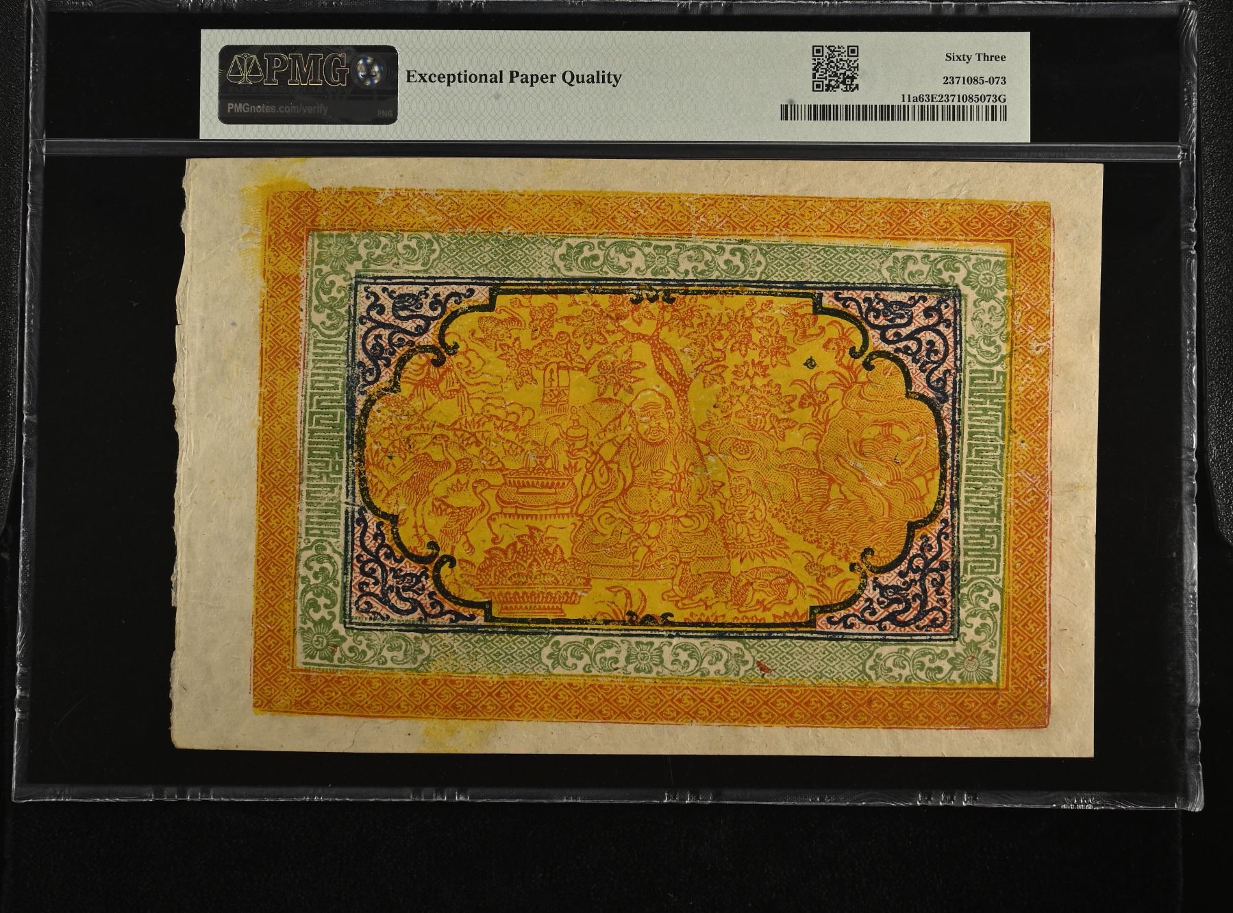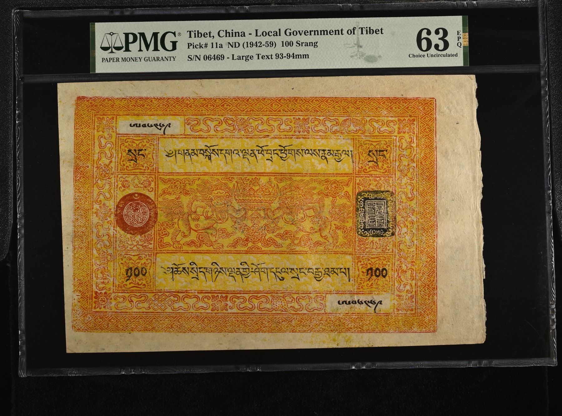 TIBET: Autonomous Tibetan Issue, 100 srang, ND (1942-59), Pick-11a, 135x210mm note, variety with large text, orange on yellow underprint, two lions with fruit bowl at center, red and black validation seals, serial number 06469, PMG graded MS63 EPQ, ex George Anderson Collection; ex Stacks, Bowers & Ponterio April 2017 Hong Kong Auction, Lot 70639 (part); ex Sir Alexander B. Lissanevitch Collection. From a group of 25 notes that have consecutive serial numbers. They were bought in Hong Kong as a single lot in the Stack's sale.