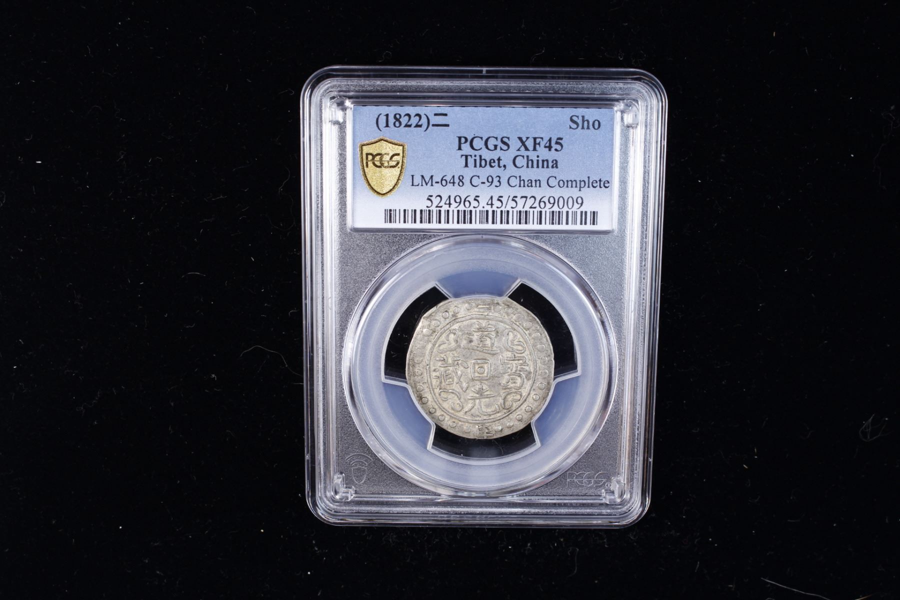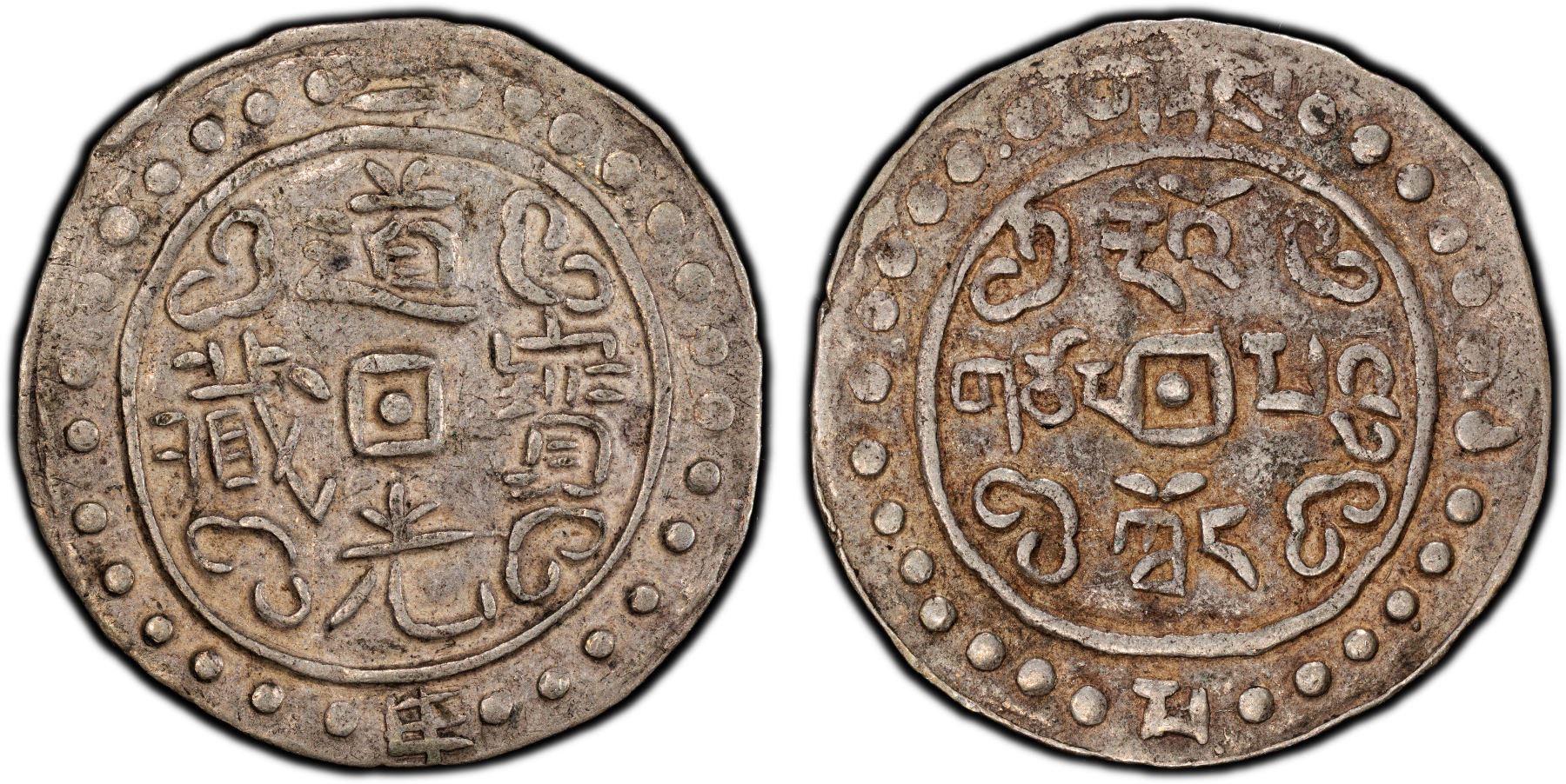 TIBET: Dao Guang, 1820-1850, AR sho (3.75g), year 2 (1822), Cr-93, L&M-648, Sino-Tibetan issue, complete 'chan' variety, PCGS graded EF45.