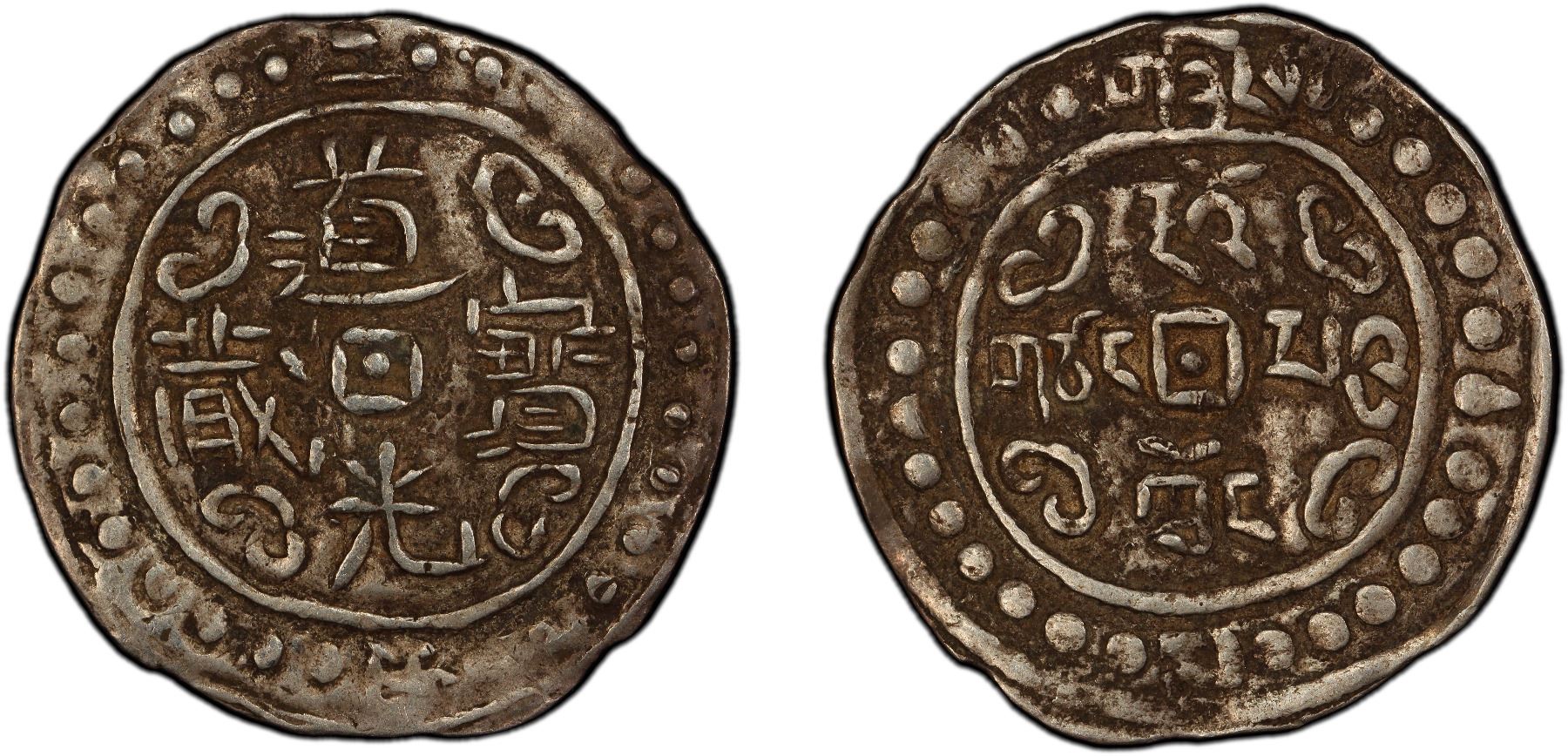 TIBET: Dao Guang, 1820-1850, AR sho (3.76g), year 2 (1822), Cr-93, L&M-648A, variety with incomplete Chan, PCGS graded XF45.