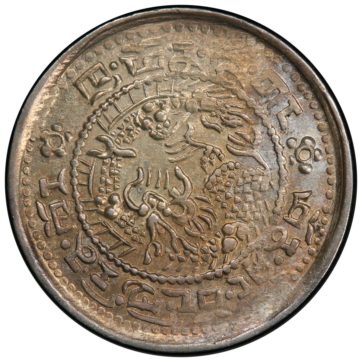 TIBET: Hsuan Tung, 1909-1911, AR sho, ND (1910), Y-5, L&M-654, dragon at center, surrounded by a string of pearls, with Tibetan inscription shon thong bod kyi rin khor khu phon zho gang (Xuan Tong, precious coin of one sho, [struck] to the Kuping standard) // five-petaled lotus design at center, surrounded by a string of pearls, with Chinese inscription xuan tong bao zang, a superbly struck example! PCGS graded AU55, ex Don Erickson Collection.