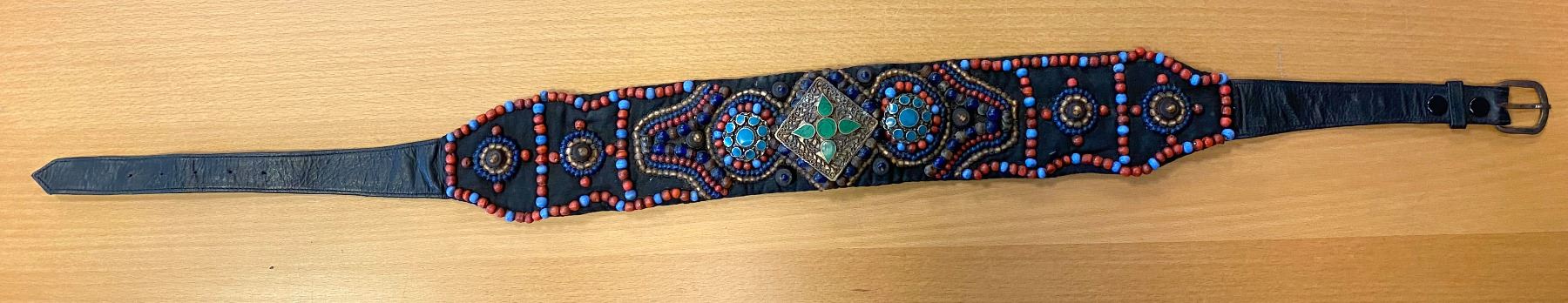TIBET: beaded leather belt, 98 x 7.5cm, comprising a 50cm-long main portion made from black cloth, fitted with a diamond-shaped brass plaque and two round silver buttons, elaborately decorated with green and blue turquoise pieces, semi-precious stones and hundreds of colorful trade beads, sewn together with a black leather belt with a Western-made buckle, VF-EF, ex Charles Opitz Collection.