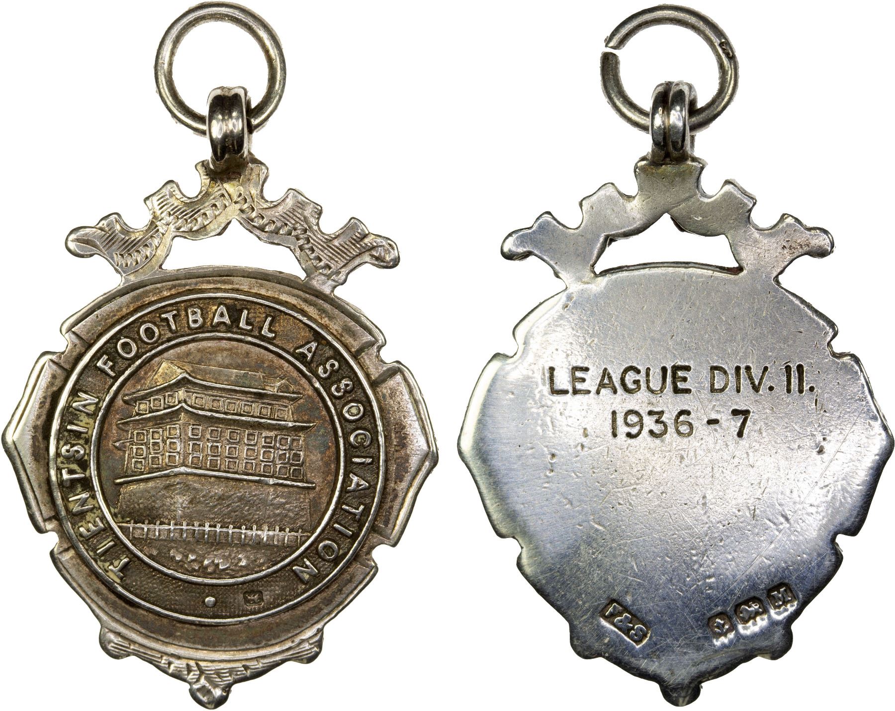 TIENTSIN: AR medal (8.45g), 1936, issued for the 1936-37 season of the Tientsin Football Association, made by Fattorini & Sons of Birmingham, historical building within center roundel on flower-shaped frame, reverse engraved LEAGUE DIV. II. / 1936-7, with maker's mark and Birmingham 1936 hallmark stamped below, attached with loop and ring, a few small marks, reverse polished, Choice VF.