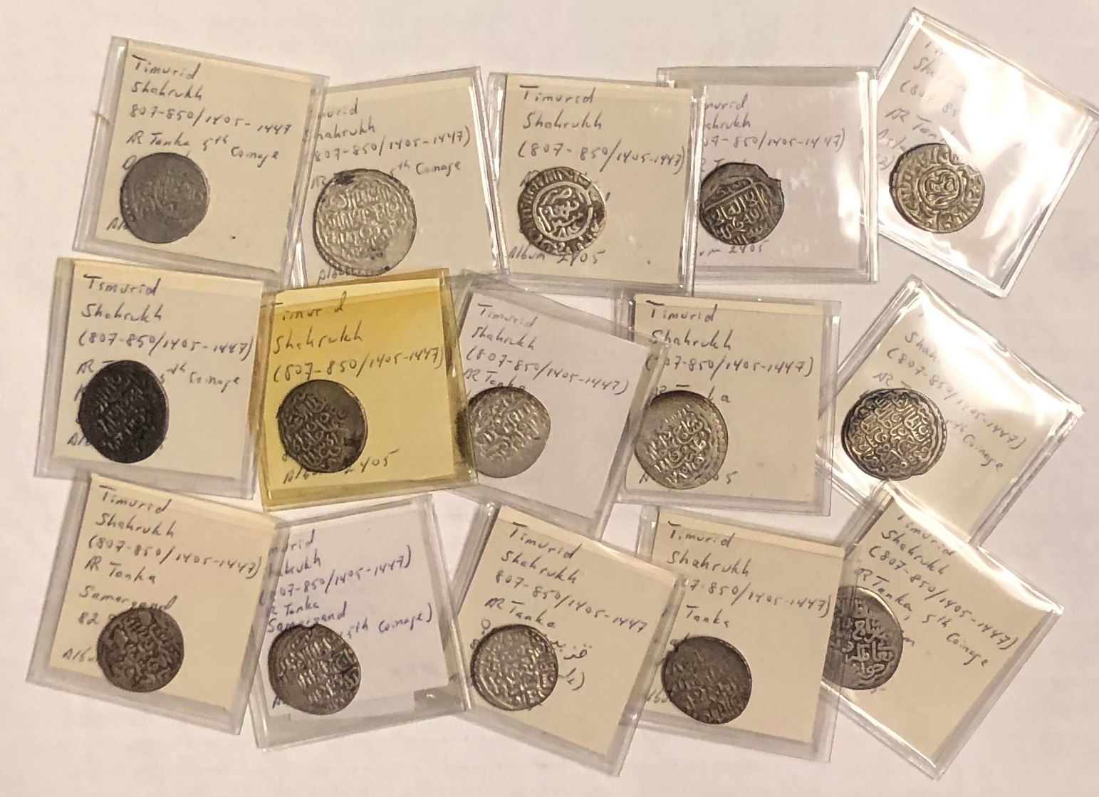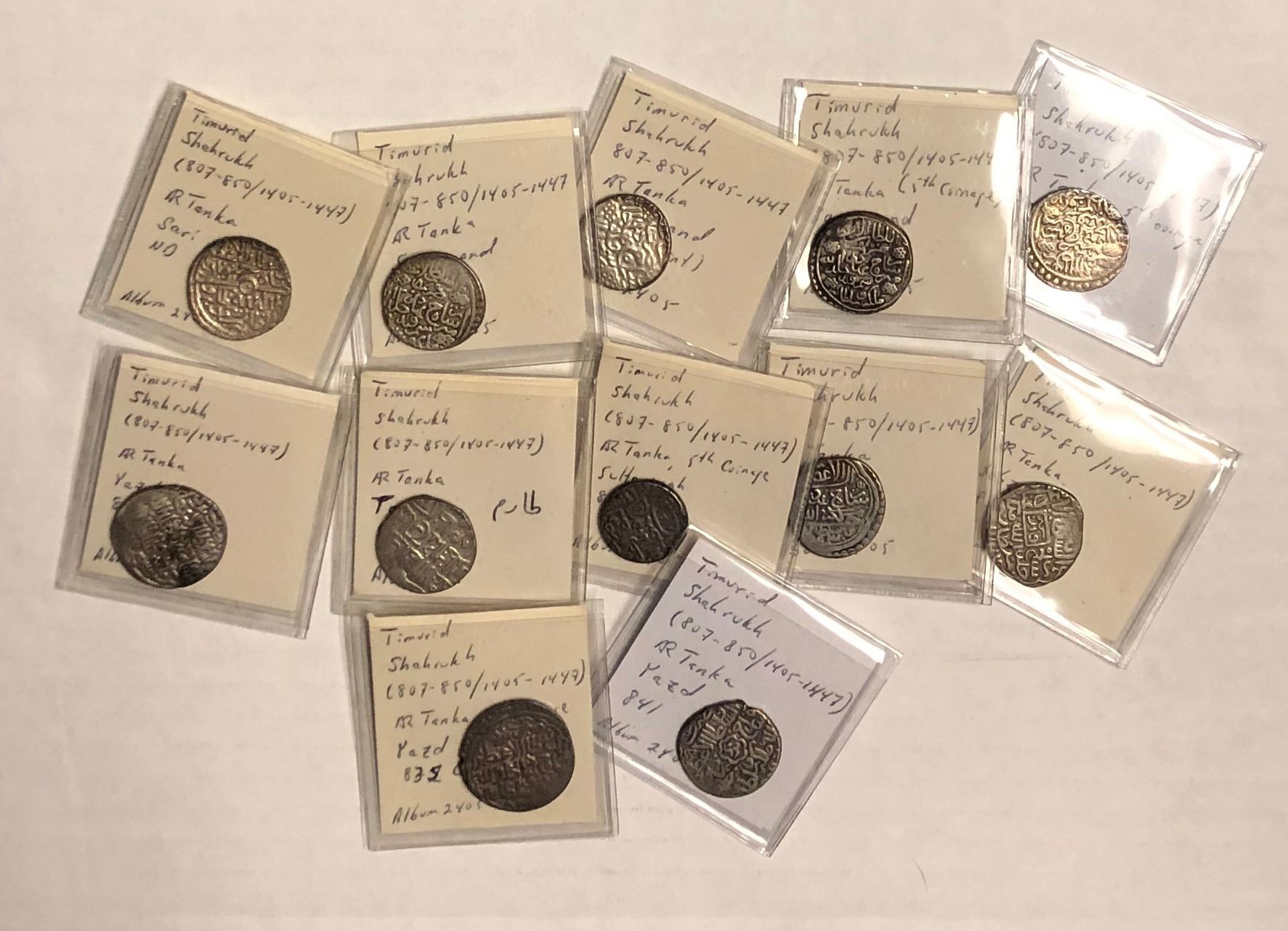 TIMURID: Shahrukh, 1405-1447, LOT of 27 silver tankas of the reform type, A-2405: Astarabad AH829, 836, 840; Balkh 828; Damghan 832, Herat 828 (2 pcs), 830, 837; Kashan (by style) 828; Khwarizm 832, Lahijan ND; Qazwin 844, Samarqand 828, 829, 830, 840, 843, 845; Sari ND; Sabzawar 837; Sultaniya 839, 843; Tarom 834; and Yazd 830, 83x, 841; average Fine condition, lovely general representation of this type; retail value $675, lot of 27 pieces, ex Jim Farr Collection.