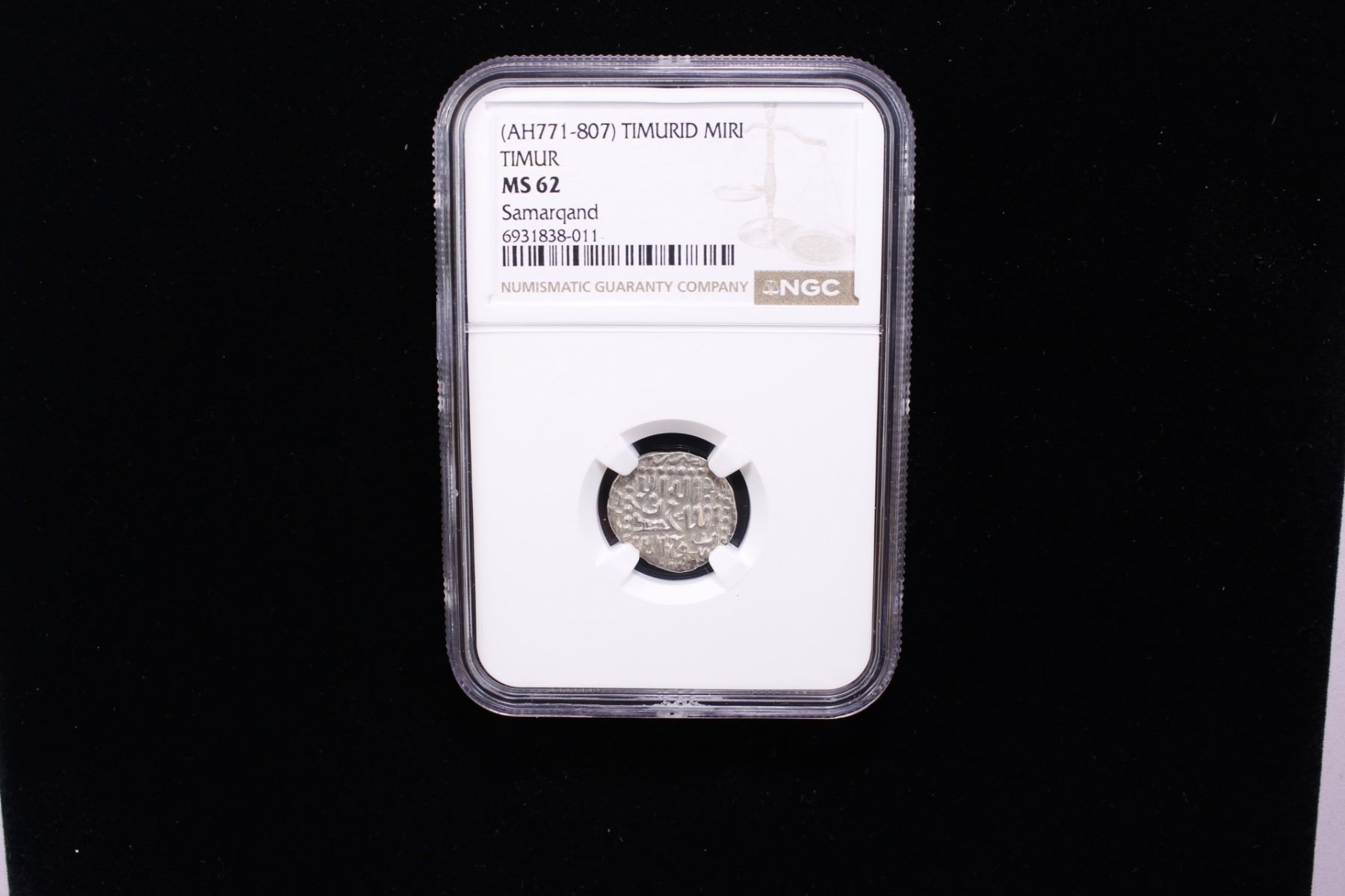 TIMURID: Timur, 1370-1405, AR dirham ("miri"), Samarqand, DM, A-2375, NGC graded MS62.